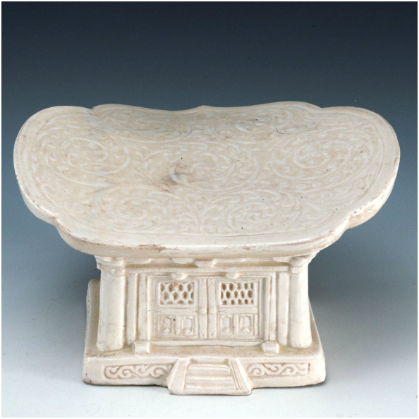 造型为殿宇式,高13.6厘米,长22.9厘米,宽18.4厘米,通体施白釉,枕面作如意头形,刻满缠枝花纹,下承仿木结构的宫殿形平座,柱、枋、斗栱、门窗、门簪、门枕石、台基、踏道,一应俱全,造型精巧别致,独具匠心。