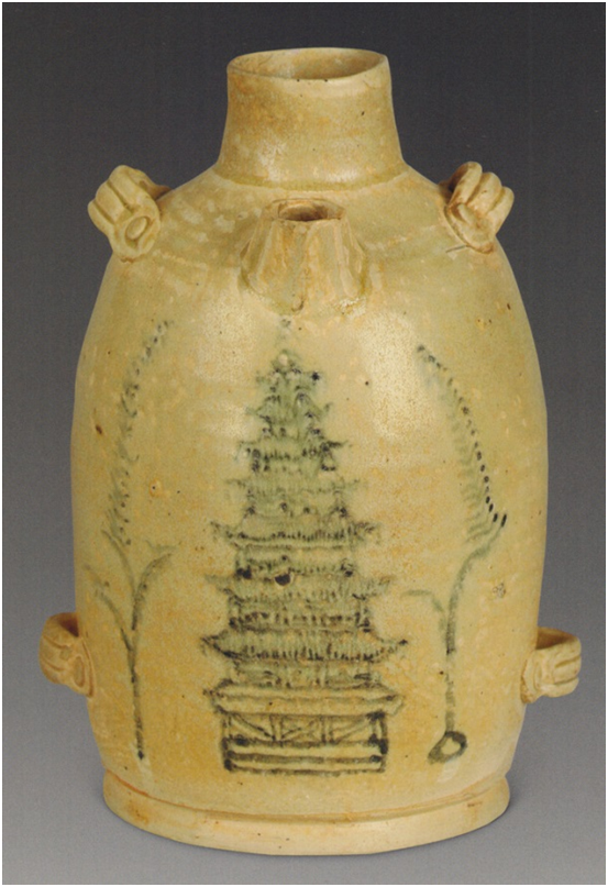 从湖南博物馆所藏的这件壶上可看到,塔的平面为唐代流行的正方形,塔建在一个有三层台基的高台之上,高台四周有围栏。塔体为木结构或仿木结构的七层密檐式塔,每一层均为三开间,中间的明间开板门,门扇上可见乳钉,门两侧(梢间)有槛墙和槛窗。