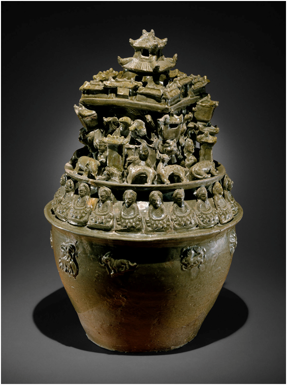 罐体上通常堆塑乐舞伶人、杂役、佛像、动物和楼阁等,以显示死者生前的身份、地位和家境,希望逝者在“冥界”中依然能够享受。