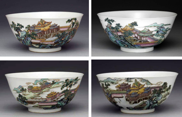珐琅彩山水楼阁碗的外壁,均采用工笔彩绘,细腻勾勒出一幅幅山水楼阁图画,所表现的殿宇式样众多,有庑殿顶、歇山顶、盔顶、卷棚顶、四面歇山十字脊顶、攒尖顶等。