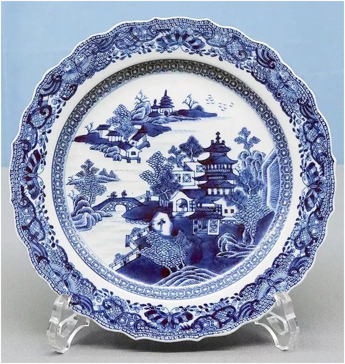 故明清时,通过海路,江西景德镇及广东、福建等华南地区各窑口,开始大量出口各类日用瓷,这类外销瓷在各方面都优于当时国内的内销瓷,是官窑之外的高水平精品瓷器的代表,其中青花瓷最多,中国传统图案和西式纹样均有,表现中式山水楼阁的青花瓷就属于传统一类。