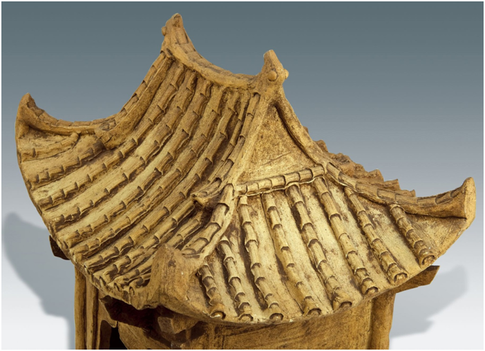这件北宋时期的陶亭,屋顶为歇山式,正脊中间有宝刹,两端有鸱吻张口吞脊,垂脊和戗脊的下端均有脊兽。