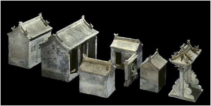 在这一时期的建筑明器上,即使是低规格的陶屋陶仓,正脊两端也有形似鸱吻向内卷曲的装饰物。这种现象,在汉代建筑明器上极少见到,很多更高规格的多层陶楼等大型建筑明器,正脊往往简洁素朴,两端通常无脊饰。