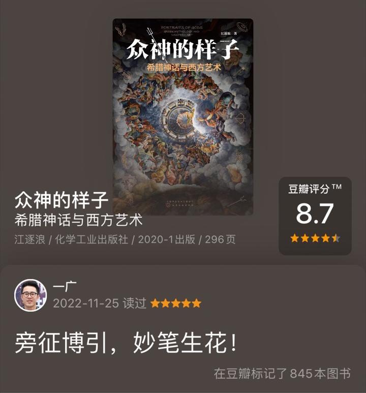 作为一个古典艺术爱好者,我对神话艺术一直非常热衷,也希望在我的更新中,写出更多有深度的知识点,而江老师的《众神的样子》正是理想的艺术科普应有的样子:旁征博引、饱含风趣!