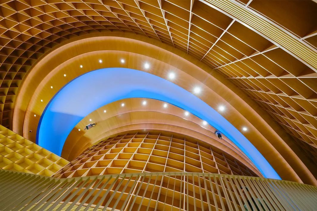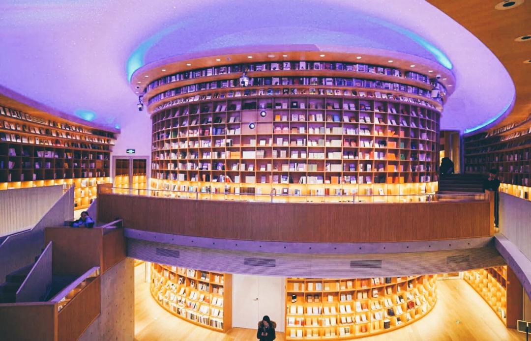 书店内部空间开阔,未来感与中式文化结合,适合不同年龄的人群前来读书学习。