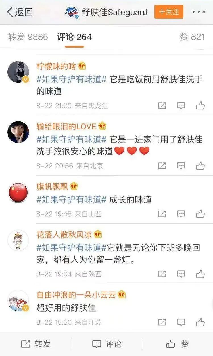 这些可以轻松构建出的画面感,让舒肤佳不再是一种单纯的“洗手液”这一功能性价值,而是升华至情感、精神层面,把“守护”二字烙印在了产品之上;除此之外,品牌并没有放弃在社交平台上的营销造势。