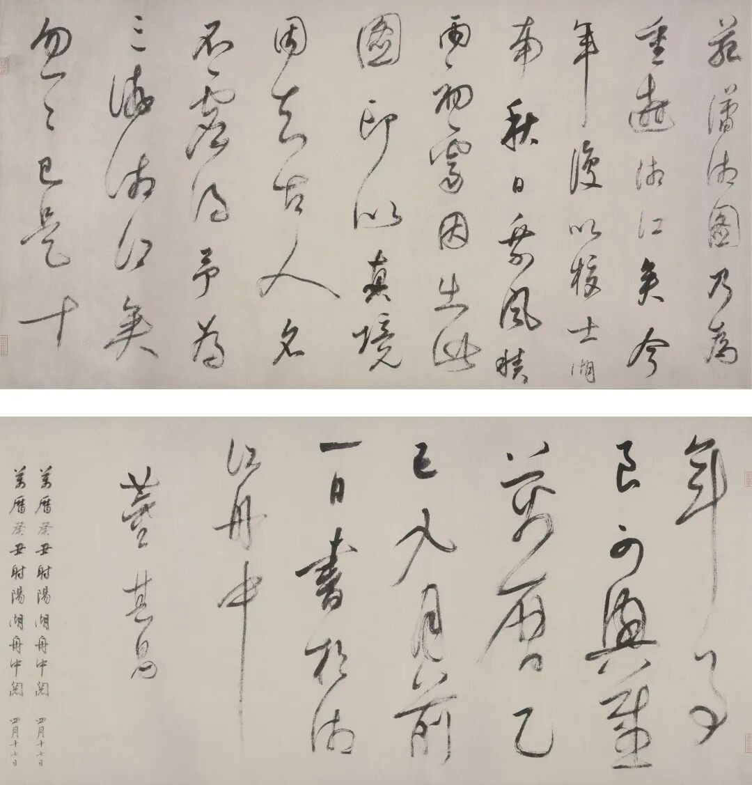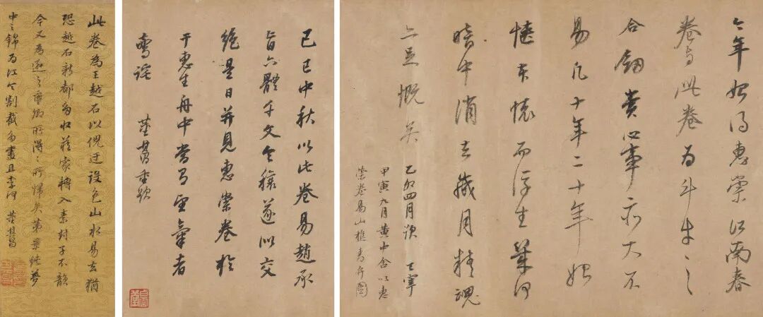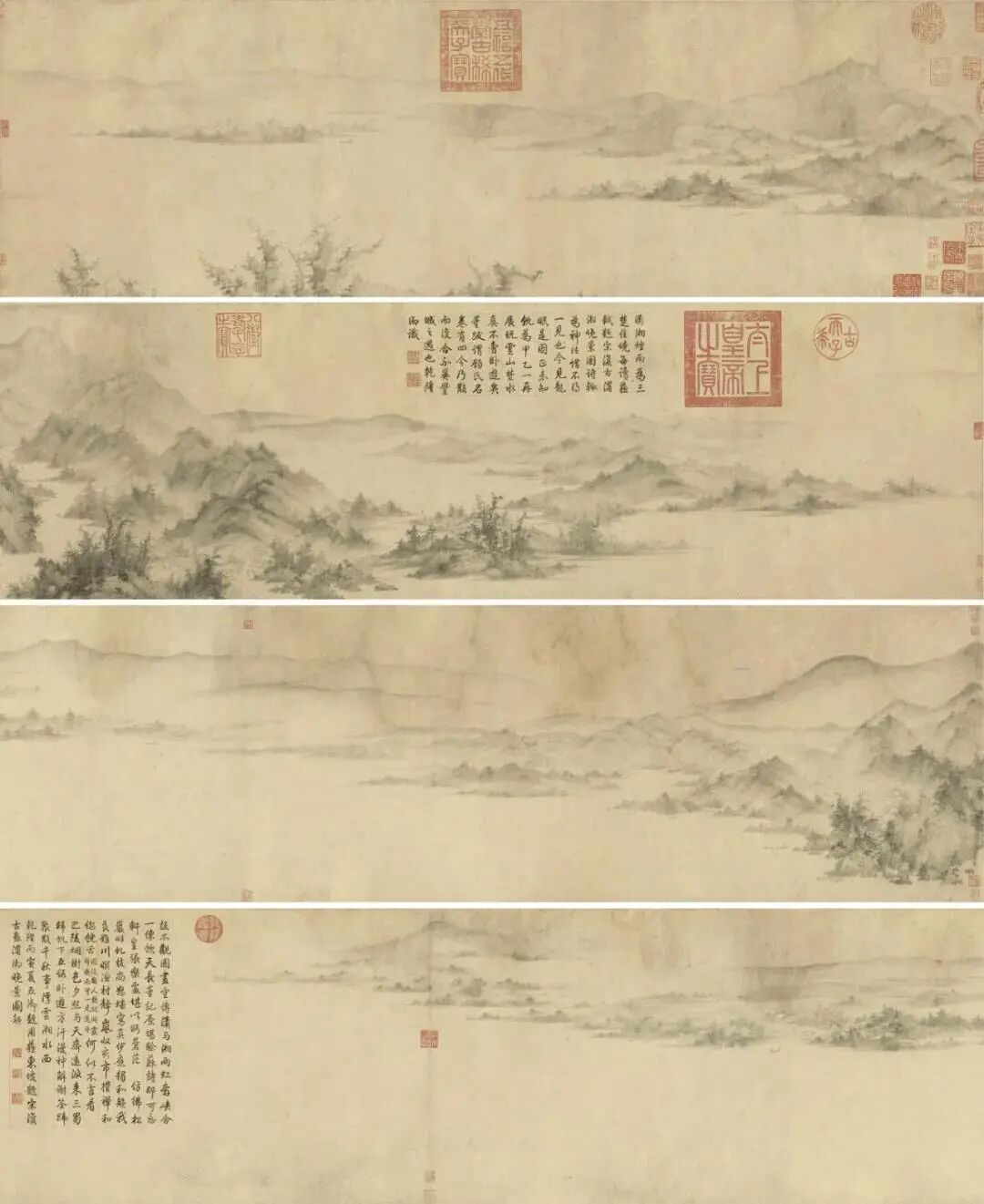 另外一幅画“舟行东光道中写此”,由于“阻风崔镇”,停船避风时,所以重题。“记忆巴陵舟中望洞庭空阔之景写此”,手卷描绘洞庭湖一望无际的水面。所以他画的与他实际看到的都有关系,而且古时候船慢慢走,景致跟着慢慢移,人很舒服,不需要走路,景致自然就移过去了,就像看电影横移镜头拍摄的画面一样,所以中国的长卷很有意思,外国就没有这种形式。这种山水手卷与坐在船上赏景绝对有关。