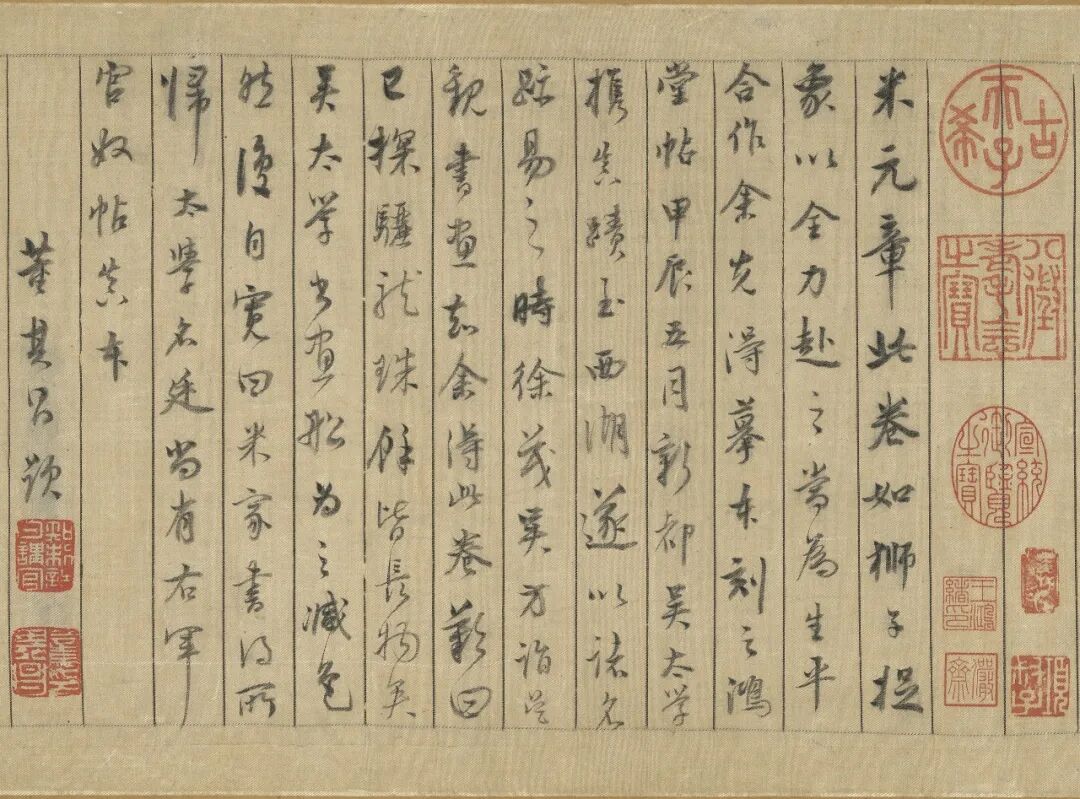 “崇宁间,元章为江淮发运,揭牌于行舸之上曰‘米家书画船’云。”这是米家“书画船”的开始。黄庭坚的诗《戏赠米元章》中有:“万里风帆水著天,麝煤鼠尾过年年。沧江静夜虹贯月,定是米家书画船。”又说“来往乘船,高揭匾额曰‘宝晋斋舫’”,就是米芾为他的船取的名字。米芾的书札也有写于“舟中烛下”的,这就是“书画船”了。有一件米芾题《兰亭序》的跋,有云“舟对紫金避暑手装”,在船上对着紫金山题跋,或者在“宝晋斋舫”上装池题跋。他有款识“襄阳米芾审定真迹”,可证他在船上随身带着他的收藏,如《兰亭序》等墨迹。