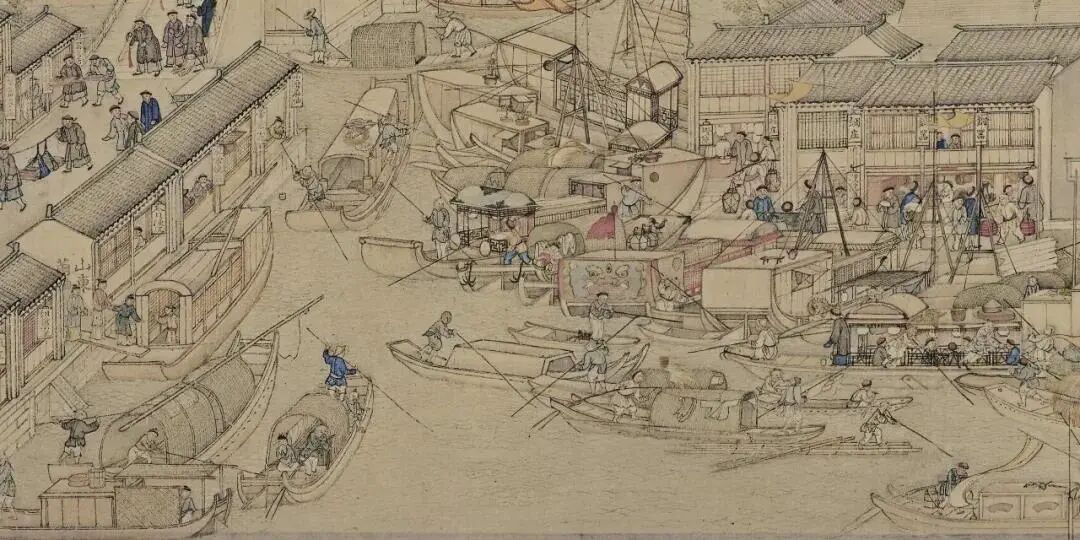 所以古时候做官的人,时常坐船去上任,或者到处去旅游。在古画里面,有描绘密密麻麻的船在城外停靠的图景。现在的交通都是靠汽车了,没有人可以在汽车里面画画,所以“书画船”是中国文化发展史上一个很特殊的现象。清代徐扬的《姑苏繁华图》中画有各种各样的船,形制与明代沈周时期差不多,在船上可以创作。在一些画面中,文人在船上,中间有书桌,他可能在读书,旁边还摆了很多书、画、卷轴或砚台等;或者官员做官退休后一家人回乡,船中间还有桌子、笔墨、线装书。