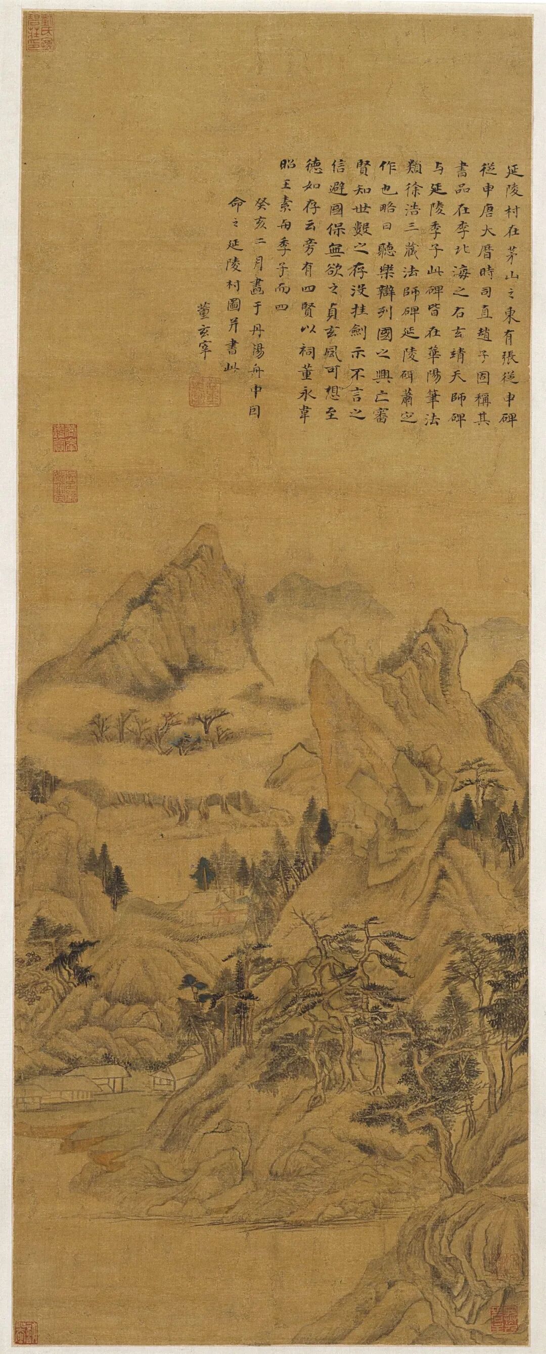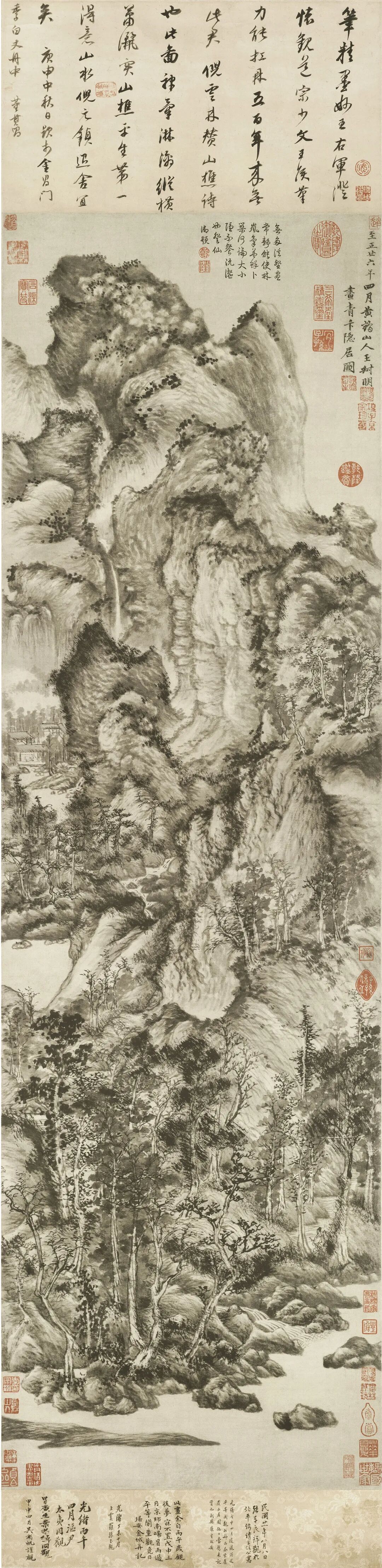 董其昌在王蒙的《青卞隐居图》上有诗堂题“天下第一王叔明画”,下面有题跋“庚申中秋日题于金阊门季白丈舟中”,是在船上写的鉴赏语。他的朋友也是把画带在船上,互相都有“书画船”,旅行的时候带着这样的名画,实在是风雅得很。朋友之间互相欣赏,还要题跋留念。他讲得不错,此画确实是“天下第一王叔明画”,虽然他后来看到了更好的,但这幅的确是王蒙的代表作。