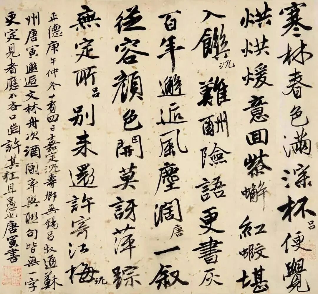 王阳明的《龙江留别诗》及其他书札也是佳例。其一“即日舟已过岩滩”,即严子陵钓台那里,富春江上。中间“王守仁拜首书于龙江舟中”,写得很清楚。另有一封信“九月廿三日岩州舟次父字”,写给儿子的信,也是在船上写的。王宠的一件手札,“搭得船好,一路想无惊恐”,意思是坐了一条很好的船,大概一路上会很平稳。这也是在船上写的信。文徵明的大儿子文彭《泊舟八里湾》落款云:“是日离下邳仅五里,风大不可行,舟中无事,书此遣兴。”唐荆川是比文徵明稍晚一点儿的书画家,其书手卷,尾云“书宋纸一卷于剑林舟中”,同样是在船上写的。董其昌的师兄莫是龙曾写过一个扇面,题有“与周文爽舟行偶作”。