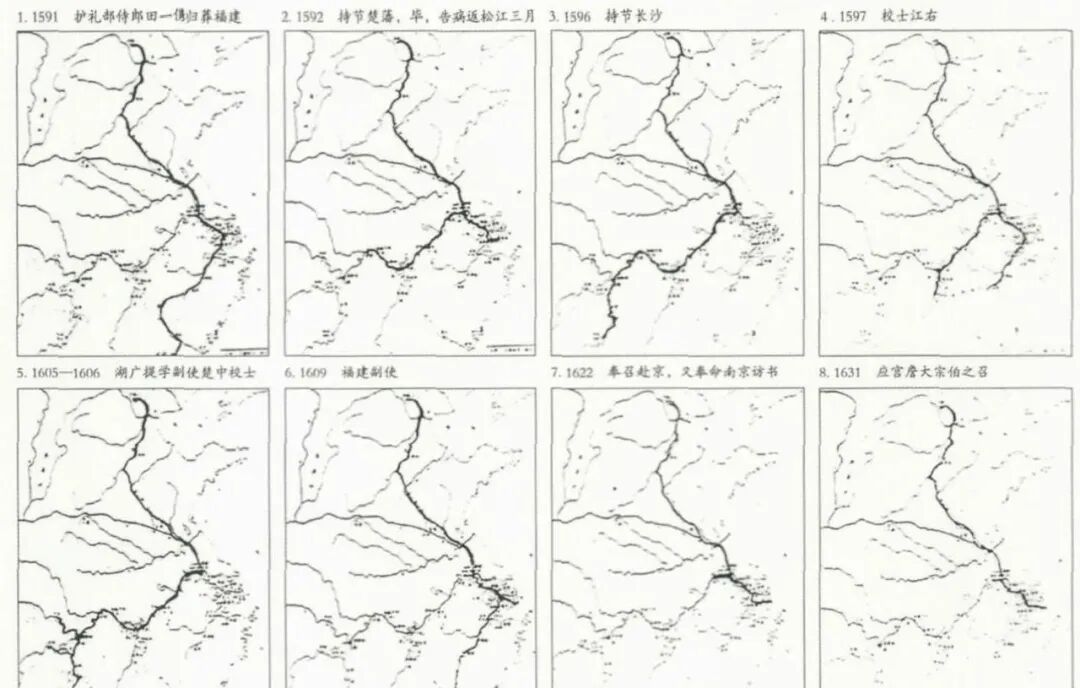 我根据他的年谱和行程画过“董其昌历次公务行旅简图”。1591年最早一次旅行,他的老师过世,所以要从北京把棺木运到福建。一路上经过山东、江苏,然后经过太湖流域,再经浙江到福建。1592年他“持节楚藩”,到湖南去,又顺便回老家一次。1596年他又“持节长沙”,来回跑,在船上花的时间很多。他船上的作品多就是由于他的特殊经历。之后,1597年、1605年、1609年、1622年又跑了四趟,直到1631年已经快80岁了,又南北跑一趟。“董其昌八次公务宦游综合水程简图”,把几次综合起来,都是走水路,包括大运河、长江、湘江和太湖及钱塘江流域。此外还有“过荆溪访吴澈如年丈”,吴澈如曾收藏黄公望《富春山居图》,他儿子在临终前把画投了火。这件作品就讲到“泊舟丹阳”,“近得子昂、大痴、云林之迹,皆奇绝,遂携至舟中,以归心甚急……”他所收的名画都在船上,随他一起走。