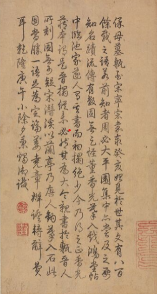 高士奇是个收藏家,收藏了很多好东西,也喜欢作长题,很多都是在船上题的。因为他家在浙江,经常坐船从北京来回跑,带着书画。“今年奉召北赴阙,‘书画船’泊胥江滨”,就是指停了船,船上带着很多书画、题字。我觉得乾隆皇帝有的时候也受他的影响,年月日都写了,甚至与家里什么人在一起,园中开什么花都写进去。