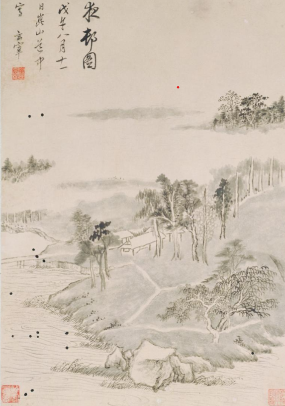 《夜村图》写得很清楚:“戊午八月十一日昆山道中写。”他在昆山道中画了一套山水册。一张小的手卷,“是岁秋携子以试事(他儿子要考试)至白门大江舟中,旋为拈笔,遂能竟之。以真本不在舟中,恐未能肖似耳”。“大江舟中”,可能是金陵的长江,说明这幅画也是在船上画的。“乙丑九月自宝华山庄还,舟中写小景八幅,似逊之老亲家”,逊之即王时敏,他们是亲家,这是在舟中给王时敏画的,也可能是两人同舟或联舟而行。