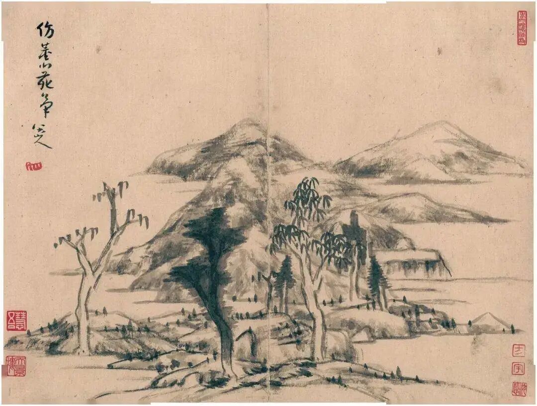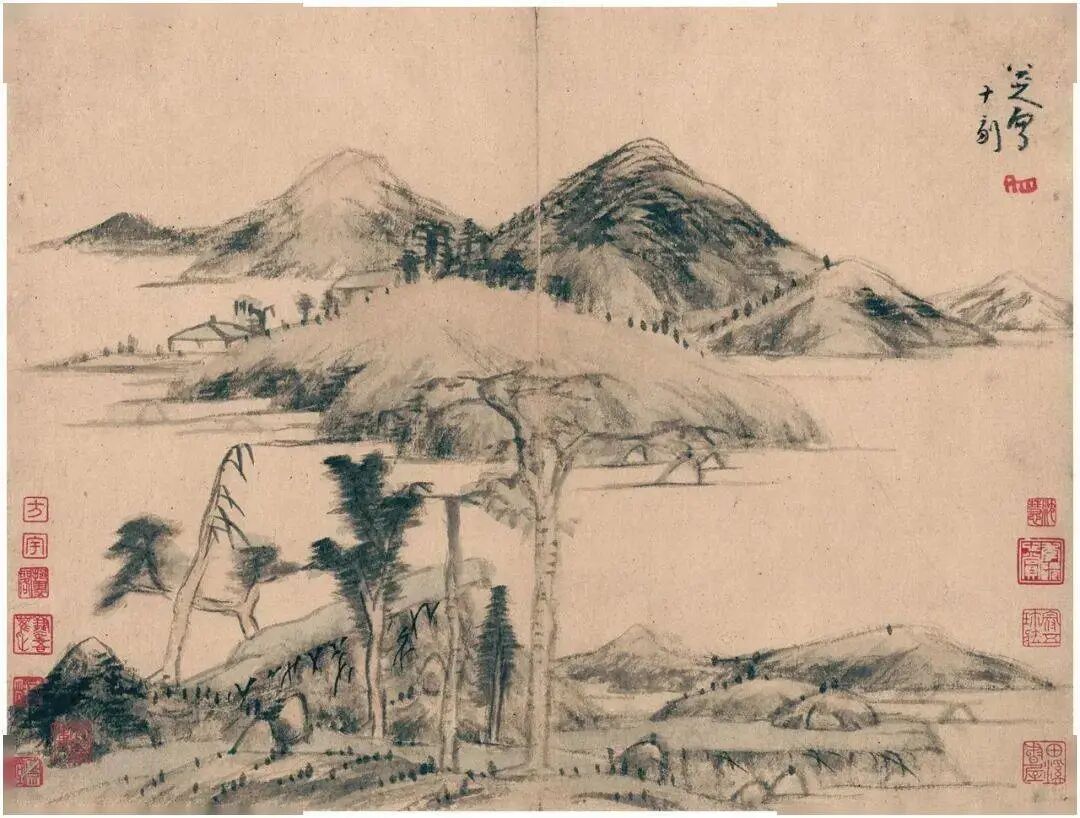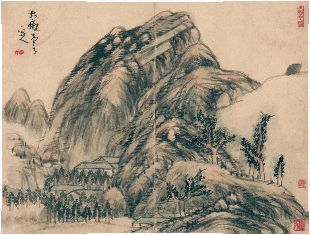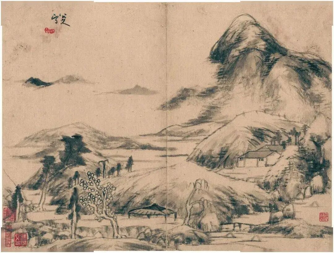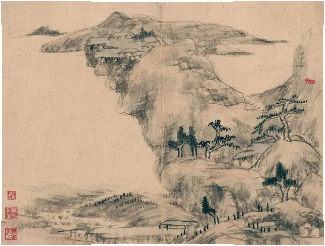 八大的山水画从董其昌入手,张大千曾总结其艺术渊源,云:『山人画法从董思翁,上窥倪黄三百年。』八大在宗法黄公望平淡严谨与董其昌秀逸大方的基础上,形成了自己古拙而苍劲、荒率而稳重的风格。在构图上,画家有意使前、中、远景的山石树木叠合,例如第七、八开,给人感觉却并不逼仄,空间感减弱而形成更具绘画性的平面感。可以说,八大在董其昌的基础上进一步强化且自觉地运用了这种『平面意识』。