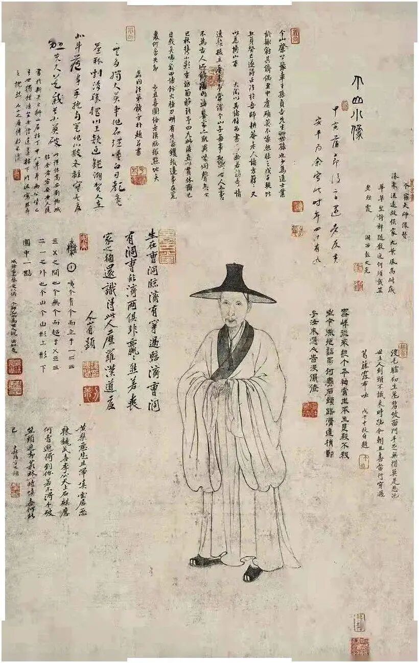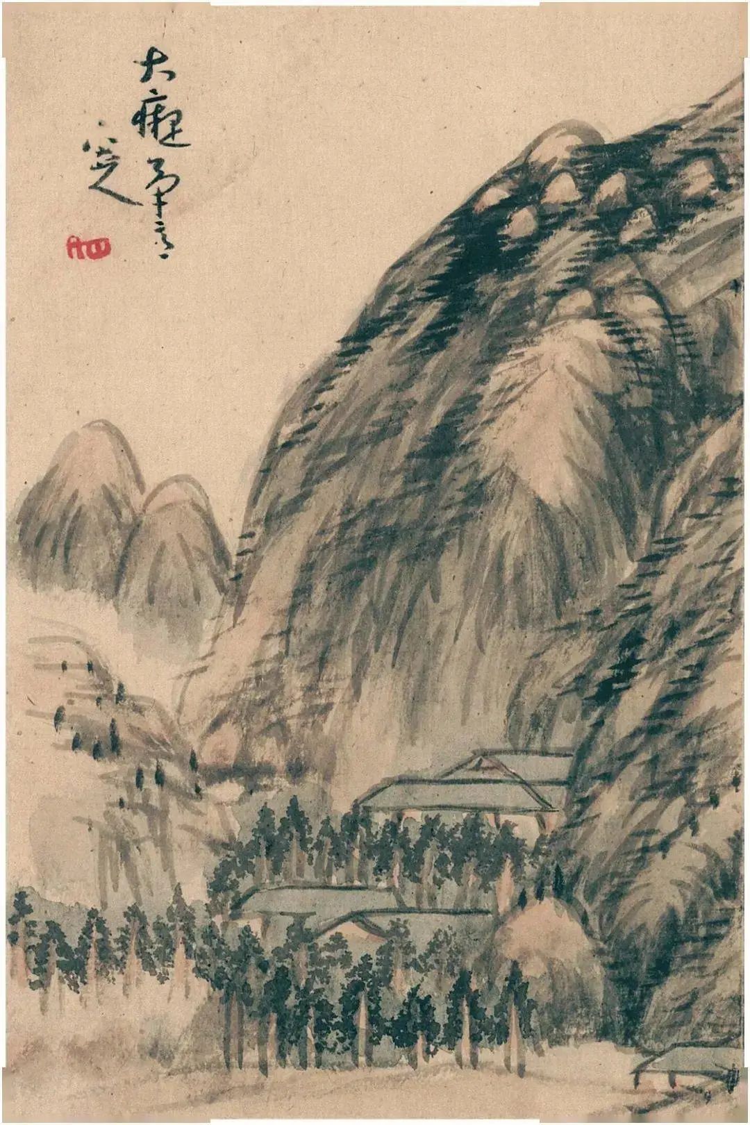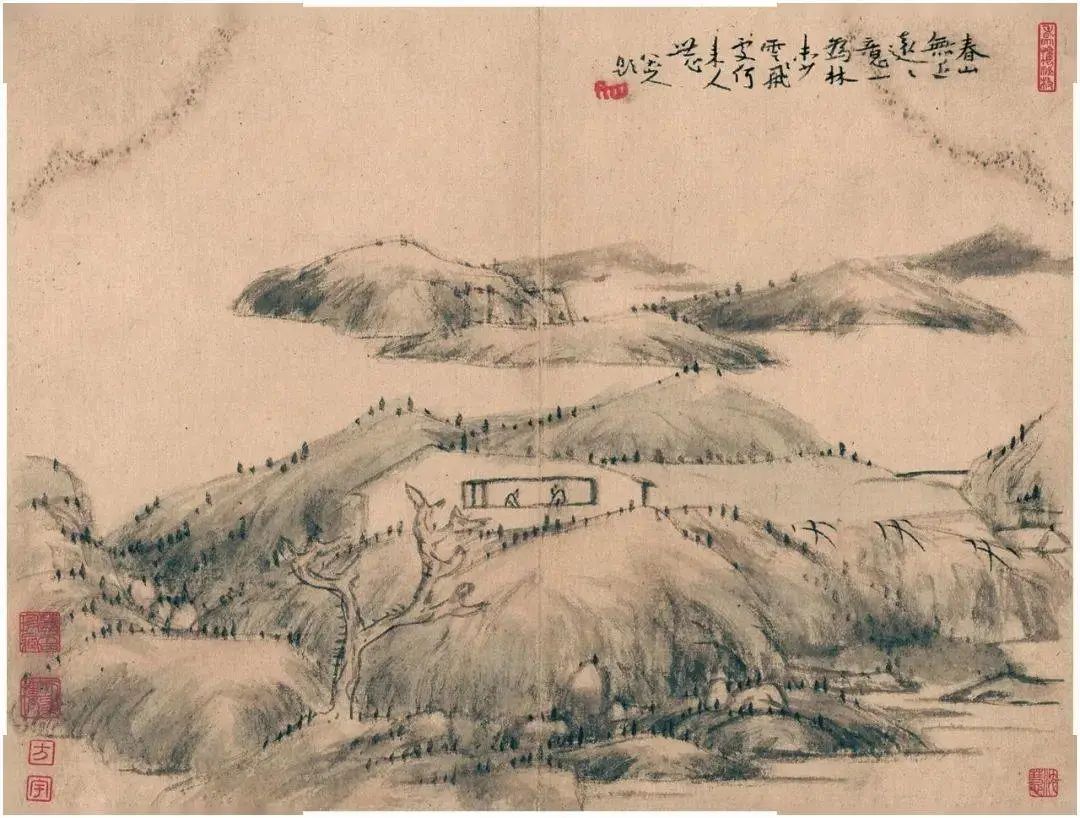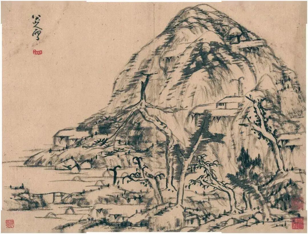 八大的山水画从董其昌入手,张大千曾总结其艺术渊源,云:『山人画法从董思翁,上窥倪黄三百年。』八大在宗法黄公望平淡严谨与董其昌秀逸大方的基础上,形成了自己古拙而苍劲、荒率而稳重的风格。在构图上,画家有意使前、中、远景的山石树木叠合,例如第七、八开,给人感觉却并不逼仄,空间感减弱而形成更具绘画性的平面感。可以说,八大在董其昌的基础上进一步强化且自觉地运用了这种『平面意识』。