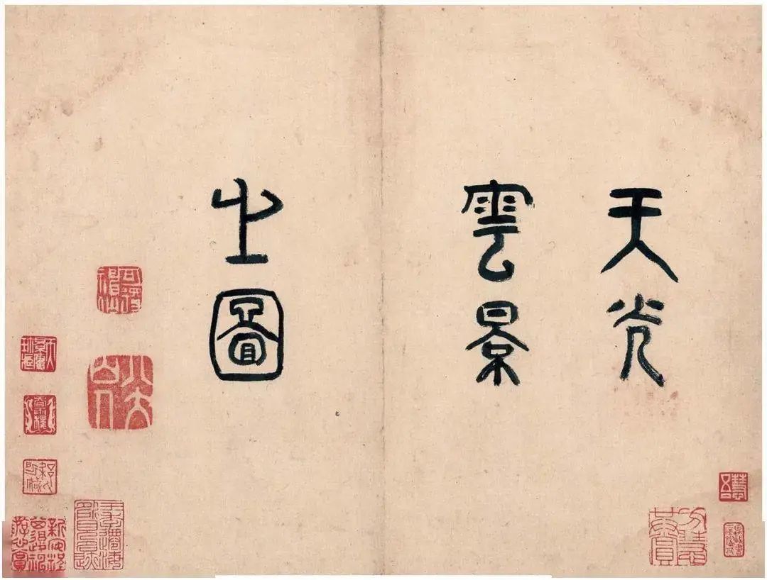 《天光云景》册 约作于八大晚年时期,也即是其进入个性化的山水画创作的鼎盛时期。原为旅美华人王方宇旧藏。 此套册页共十开,每开纵25.8厘米,横34.1厘米,纸本水墨。引首为八大山人篆书『天光云景之图』,并钤『可得神仙』『八大山人』两白文方形印。第一、五、七开题款『八大山人写』;第二开题诗:『春山无远近,远意一为林。未少云飞处,何来人世心。八大山人题。』第四开题款『大痴笔意』;第六开题识『米家画法。以此品为第一』;第八开题款『仿董北苑笔』;第十开题款『八大山人写十副』。画心各开皆钤『八大山人』朱文无框屐形印。书法方面,八大前期学董其昌,行草深得董华亭意。后转学黄庭坚、米芾,晚年学索靖、王羲之、怀素。运用圆笔、方笔、枯笔、湿笔,节奏变化丰富,空间畅达。