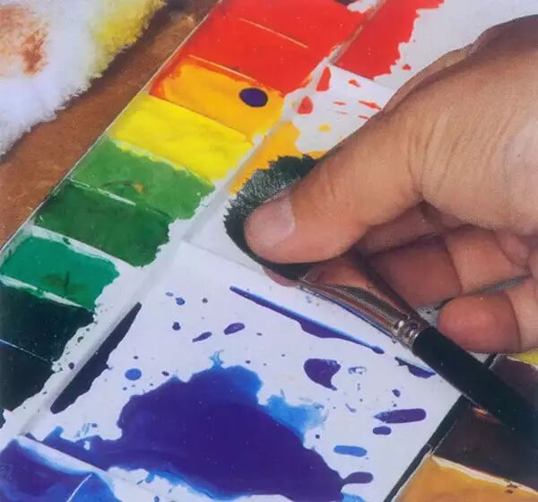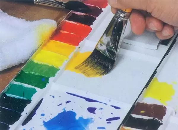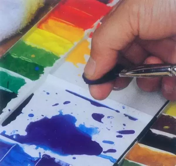 调配新色彩时,画笔要冲洗干净,而且多准备几支笔,用于调配不同色相类别。调色盘上按照色相顺序排列颜料,这不仅方便区分色彩之间的微妙差异,也有利于归类混色。如果总在调色盘的相同位置调配同种类型颜色,没有必要每次都清洗调色盘。