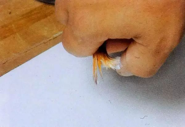 画笔蘸上高浓度颜料,用手指挤笔尖部位的颜料,使其含量适当且笔毛分散开。