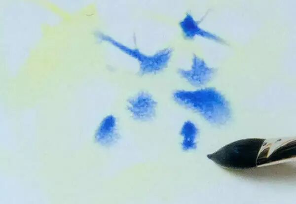 1. 以大量的水分涂出将要着色的形态。图例中带有色彩,这是为了便于察,所以在水中掺入了少量的颜料。