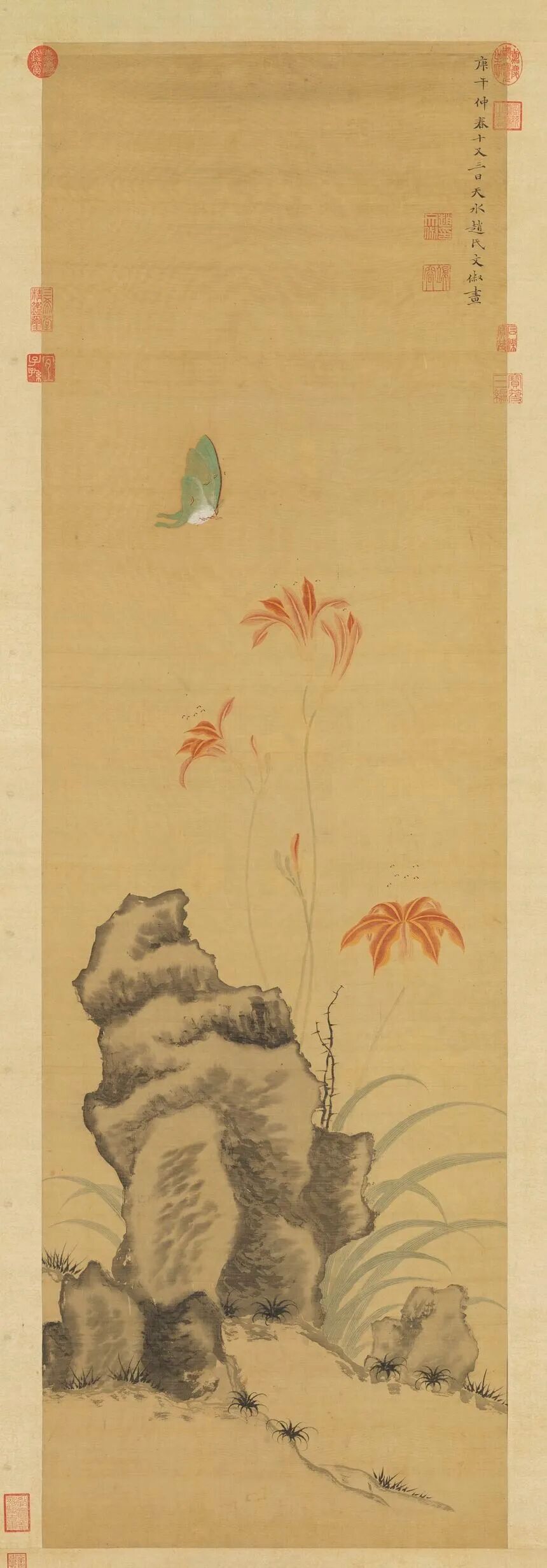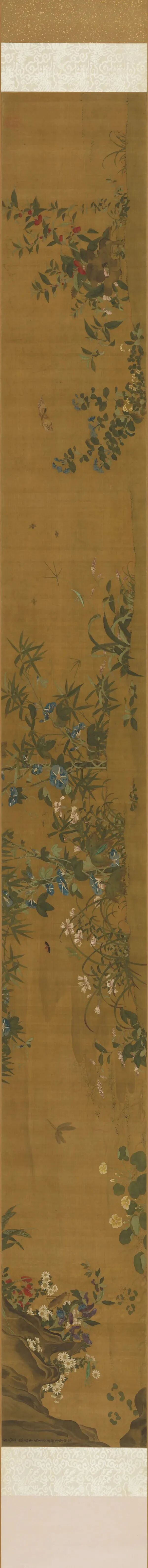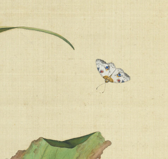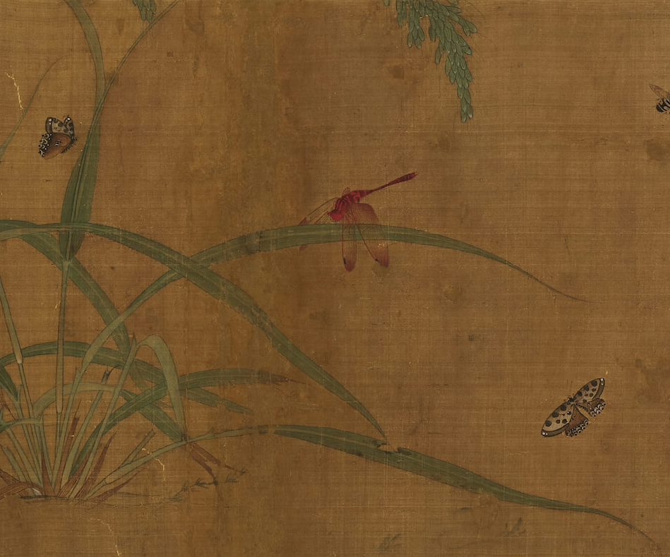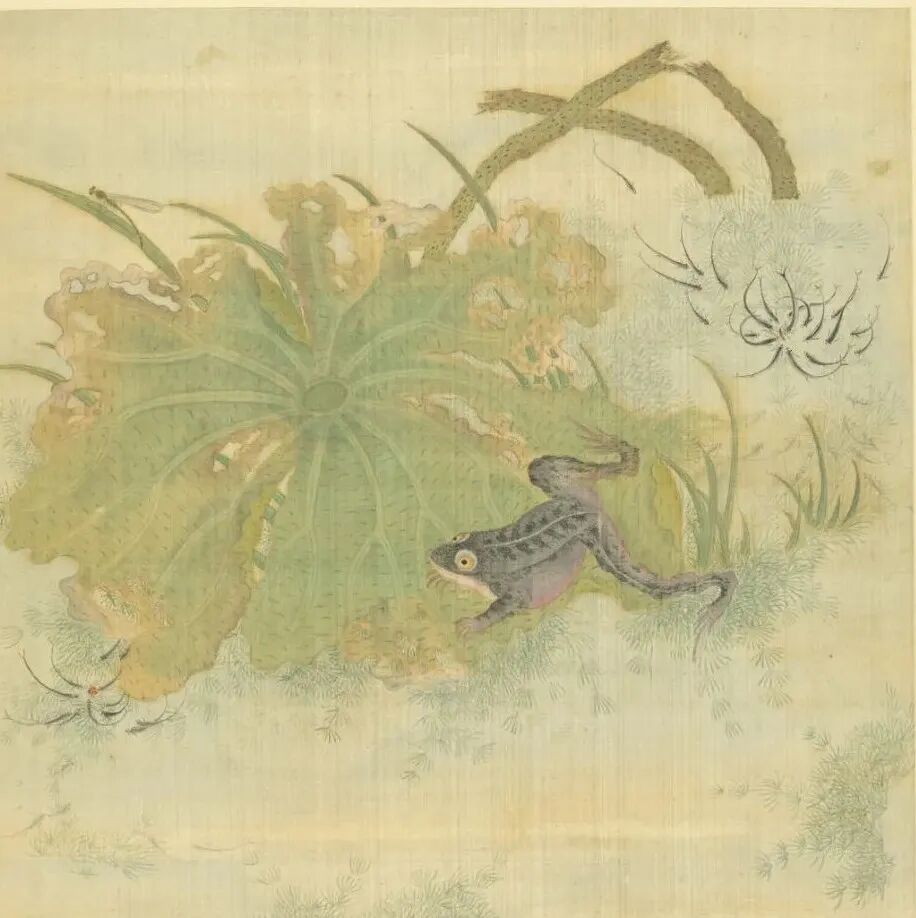 由于昆虫尺寸微小,册页或扇面就足够成为草虫画的舞台。不过古代还有不少草虫画作,画在手卷或立轴上。观赏这类尺幅比较大的草虫画,特别容易得到玩捉迷藏的趣味。因为叶子上、石头边、水岸旁,每个画面的小角落都可能藏着之前没发现的小昆虫与小动物。