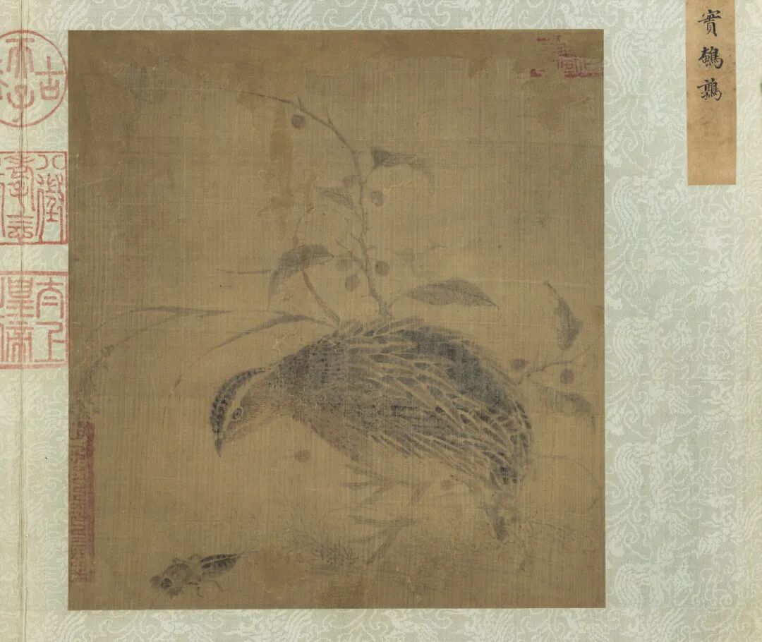 鹌鹑的“鹌”,发音与“平安”的“安”相同,所以鹌鹑的图像一直备受欢迎。秋天结果的“枸杞”则寓有长寿之意。“蝼蛄”是容易伤害农作物的昆虫。因此,这幅《杞实鹌鹑》可以解释为具有祈求平安长寿、摒除灾患的含意。
