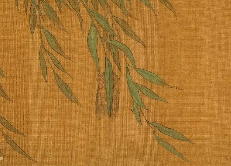 柳叶经常与鸣蝉一起出现,如王安石“柳叶鸣蜩绿暗”,因此蝉腹示人可能也暗示着蝉鸣,雄蝉正是透过腹部发出声音。蝉也具备“文、清、廉、俭、信”五德,成为读书人的楷模与喜爱的图像,可以表达自身的高洁,许多文物上都能看到它的身影。