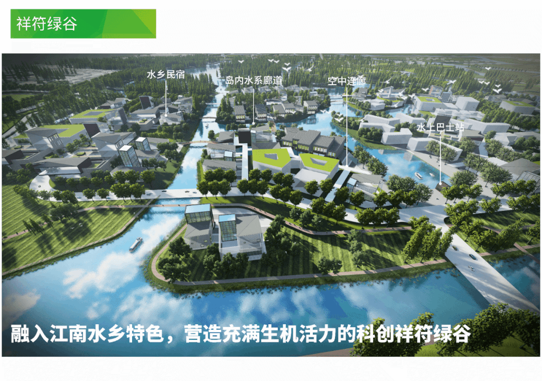 计以南祥符荡为展示节点,设置农田湿地监测中心,水路可直接与西塘接驳,同时,伍子塘于西侧穿流而过,形成大美田园绿道。并将生态肌理导入岛状地块内部,增加水系和农田景观,营造充满生机活力的科创绿岛。水体封闭管理,便于控制水质,形成可以玩水,亲水和水上运动的特色区域。