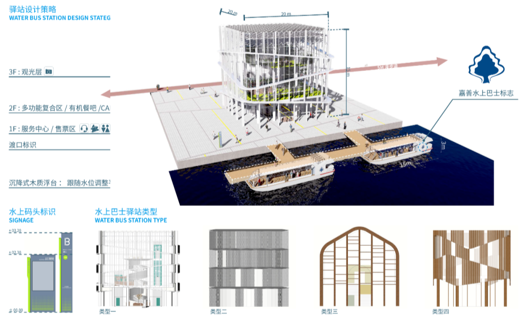 用水上巴士唤醒伍子塘,激活两岸,塑造新的场地记忆点。从而实现三大任务,承接南北的时空纽带;全龄、全域、全时的未来水乡社区;再现嘉善历史长河的人文卷轴。