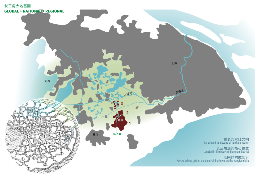 嘉善地处太湖自然流域与上海都市地貌中间,是江南小城的水乡风貌,以湖荡圩田水网肌理为主,设计从长三角“大地基因”出发,提炼出属于嘉善独有的大地基因,以“水乡新生活”为设计愿景,将整个30KM的南北通廊分为嘉善独有的三大与水共生的城景模式