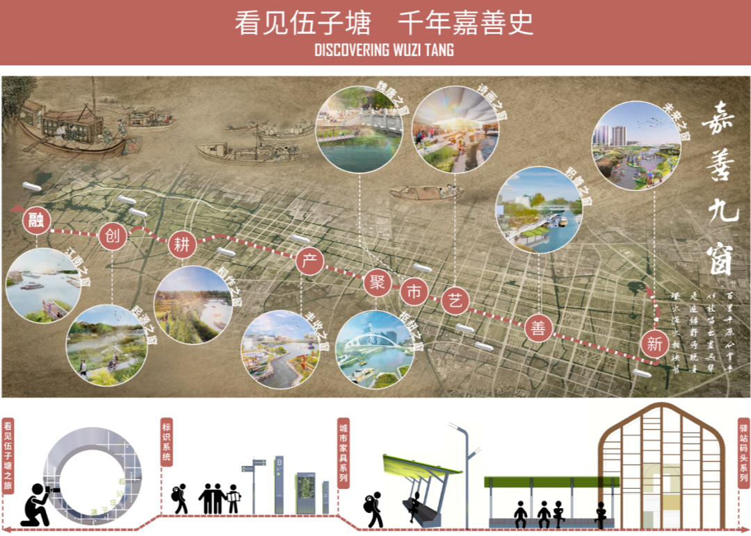 通过提炼嘉善的文化历史,提出“看见伍子塘,千年嘉善史”的愿景。以伍子塘两岸风貌为载体,打造九个文化展示窗口。从大往遗址的渔耕猎作到吴根越角的烽火战争,从阡陌纵横的治水营田到星如棋布的市井繁华,从尚武强悍的越人风习到崇文重教的江南儒雅,从耕读传家的乡村生活到创新开创的现代文明。