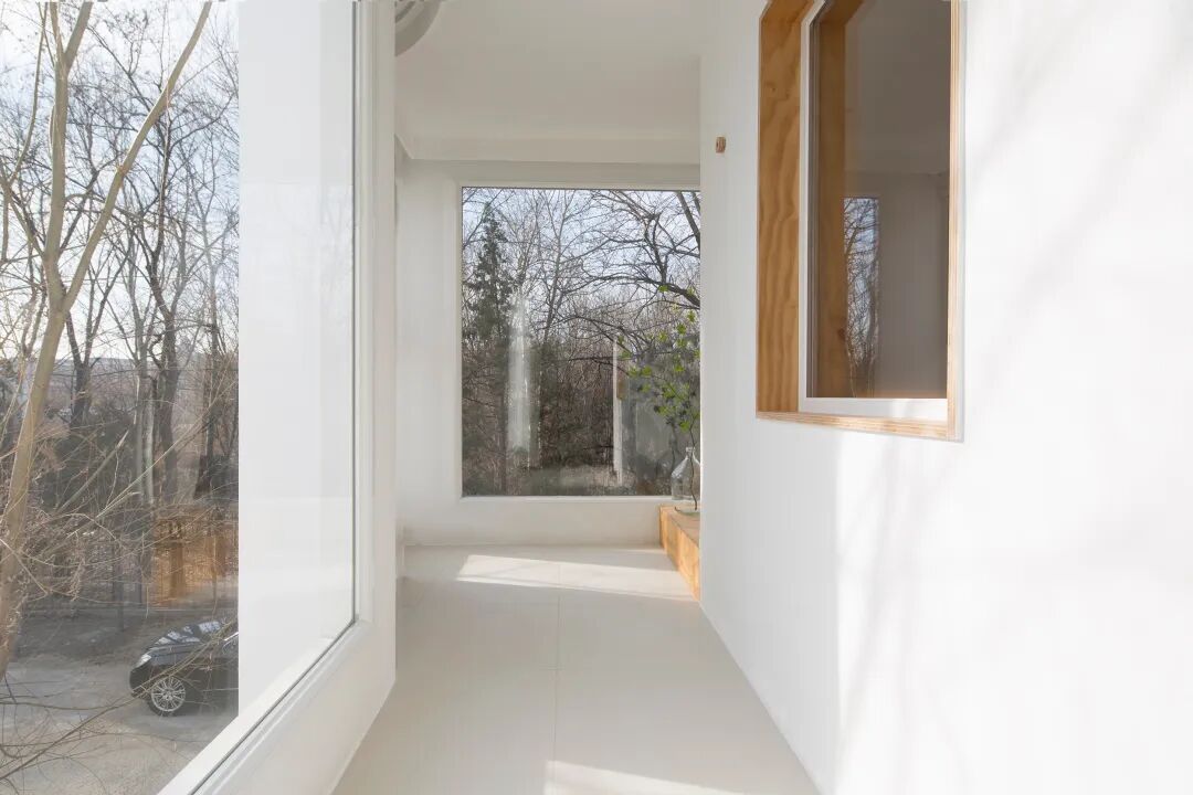 周边的环境缺少景色的条件下,我们决定制造向内的风景,营造出一个别具意趣的私密花园,于是便有了围合式庭院空间的设计构想,仅在南侧围墙上开拓少许框景式的洞口,除了蓝天白云,纷杂与喧嚣都被隔离在墙外,而院内建筑的大玻璃窗,则积极地引入庭院内的景与光,成为室内空间体验的一部分。