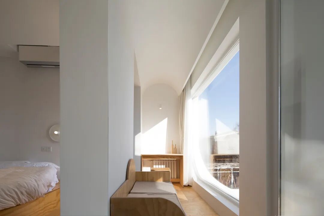 客房内一体的木制家具与白色形成鲜明对比©多么工作室