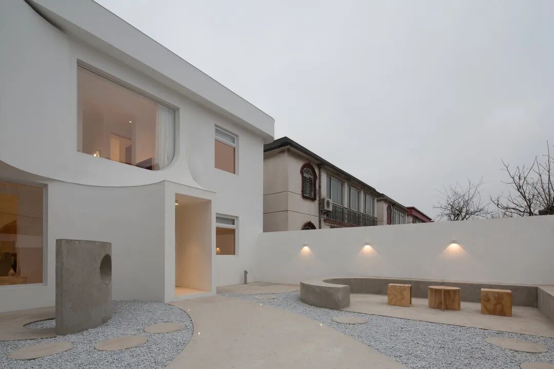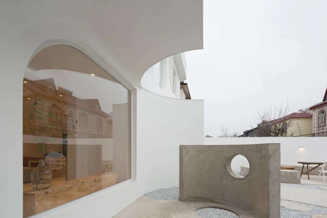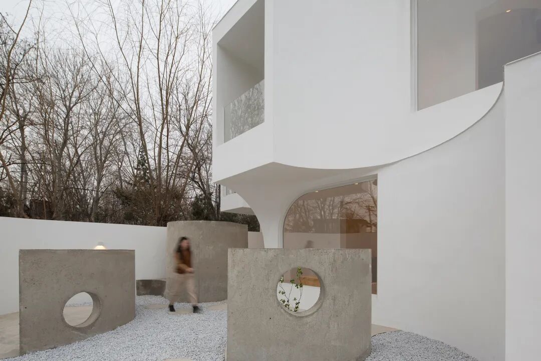 建筑与室内的设计语言是以一道1/4圆弧为出发点,以严谨的态度自由地流动在空间里,通过几何构成的方式来增加建筑的张力。立面上向外延申的建筑体块,以流动的姿态向自然靠近,将建筑、自然与人的距离拉近。而白色的外墙使得建筑变得抽象而有雕塑感,通过白色材质的渲染模糊了墙和顶的界限,流动的空间和自然的光线交融在一起,带给人纯粹的体验和想象的空间。