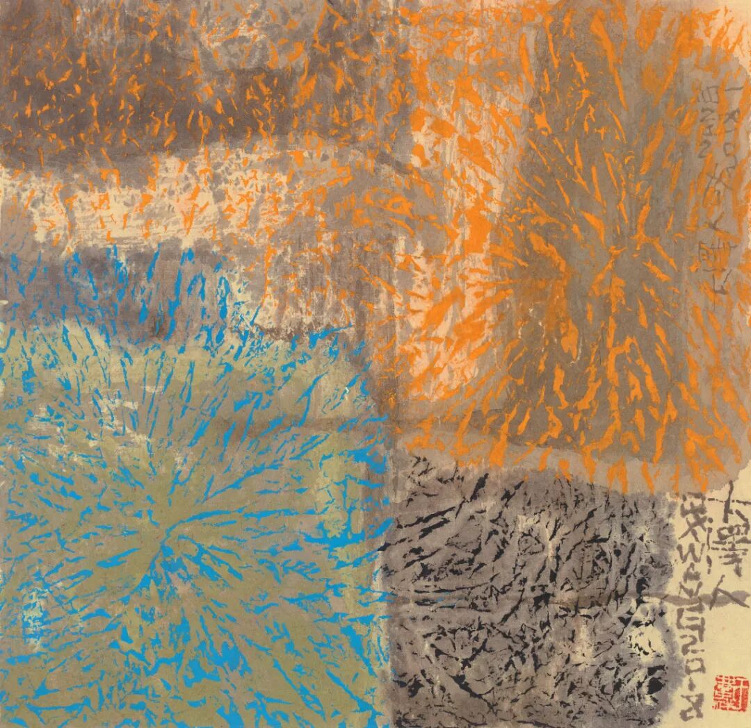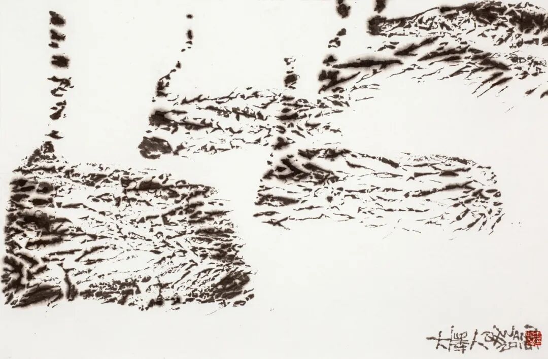 大泽人这种洋溢着观念色彩的水墨形式及其表现语言是极具挑战性与超越性的。它的笔墨抒写与点线、墨、色的组合,已经超越了狭隘的传统文化范畴,而上升为一种普遍性的人文精神寻求和心灵图景折射。我们在《千家诗》等一系列作品中,感受到源于历史文化的凝重化处理和渲染。画家借鉴了碑学的气息和美感,以苍茫的笔意为作品平添了壮伟与浑然。