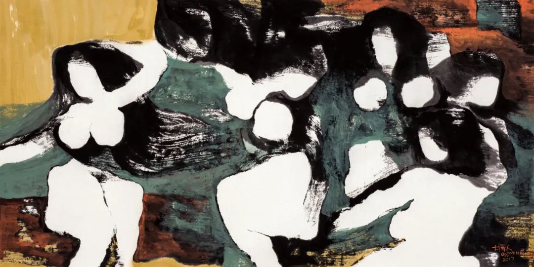 多年来大泽人一直在持续创作浴女系列,浴女几乎已成为他的人物画的标识和品牌。他以醒目的墨线塑造的浴女形象,朴素、大方、单纯、健美,造型高度简化、夸张、扭曲、变形,比塞尚简化的自然主义的浴女更加抽象,接近毕加索的立体派变形人体或米罗的超现实有机符号,可能也吸收了汉画像石和非洲民间木雕的古朴稚拙的造型元素。再比如《夜宴图》系列,保存古典唐代宫女形象,再现热闹的夜宴生活,画面只留下身体的形制和律动,虽为抽象,但任何人都能感到那种淋漓尽致的美,充满了动感、光感和立体感,饶有奇趣。
