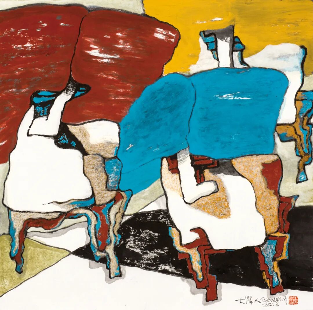 万物皆有物性和灵性,为物性造型是一种意图,为灵性造型则是另一种意图。无疑,大泽人选择了后者,他在为灵性造型。就拿画牛来讲,他画的并不是牛的模样,而是牛的性格和脾气,以及他对牛的认知和情感等。在《牛的故事》系列中,大泽人常常用夸张的牛角和硕大的体型张扬牛的力大无穷、坚韧不拔、摧枯拉朽和一身正气。作品中牛的形象表现形式并非写实,而是一种灵性的探索,是把牛赋予了一种品格,一种物性之外的解读,是抒发情绪,脱离了普通视觉造型的传统趣味,而更多地是在现代语境中寻找民族性与普世精神。