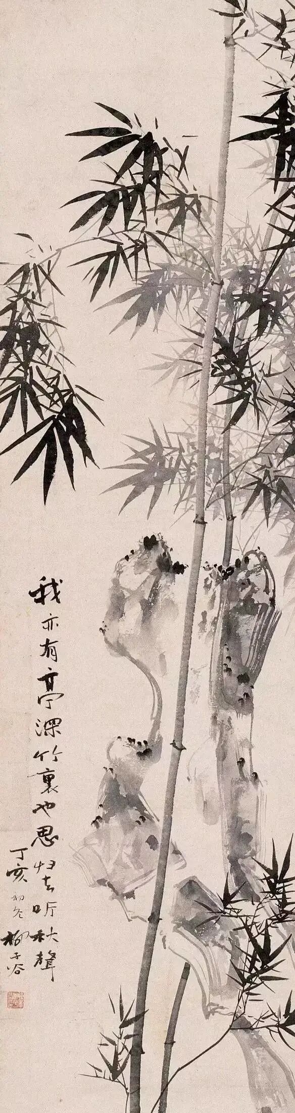 画竹最难的是画叶,下笔要有骨有肉,实按而虚起,一抹便过,不要迟疑,方能浑厚,竹叶的姿态丰富而多变,叶叶叠加,姿态飞舞,孤一并二,探二聚五,叶分老嫩,有阴阳之分