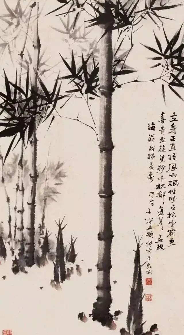 画竹的姿态,主要取决于干和枝叶的态势,画干宜在婉媚中求刚正,画节要在断处笔断而意连,画枝要坚韧而挺拔,柔中带刚,画叶要硬朗中求柔美,干、枝、节、叶形神兼备,主要体现柔和之美。