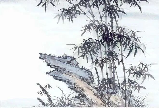 小竹画法,长的竹杆须画节,而小的竹杆则不须要画节,画叶先浓后淡,注意有参差变化,虚实变化,渲染时处空白层次越显得厚重,如果想染色,先用淡墨染,后用花青色染,如果不想有笔痕,则外轮廓不要溢出。