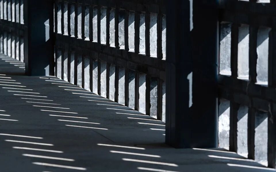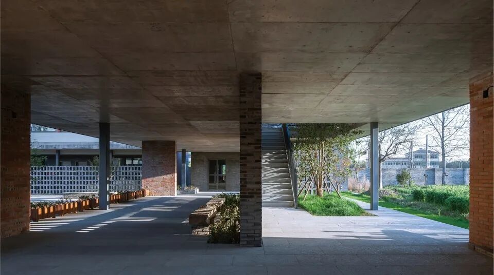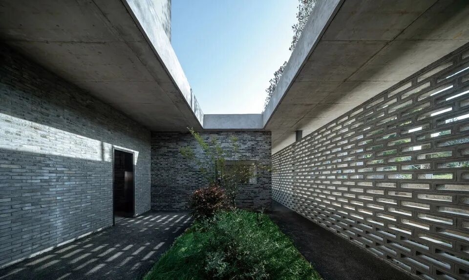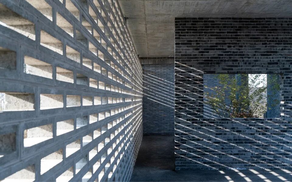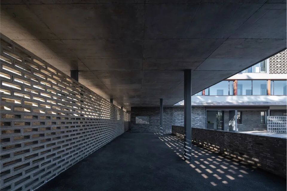 以错缝的方式砌筑空心水泥砖,因实体进深的不同,在立面上形成微妙的光影,并保证室内走廊避免了阳光的直射,在其间穿梭的人群也能感受水泥砖光影变化所带来的温和氛围。