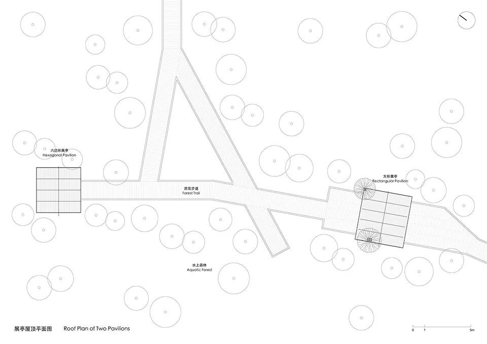 我们基本的设计概念是,以最小的限度介入环境,以最大的程度融入自然;并将此临时性展览建筑定位为“亭”。类似于中国传统建筑中的亭,我们的临时展亭具备“外观”和“内观”两种属性:在水上森林中观看展亭时,它们优雅而谦卑的与自然和谐共处;在展亭内观赏展品时,亦可没有隔阂的充分体验森林。