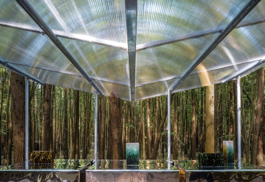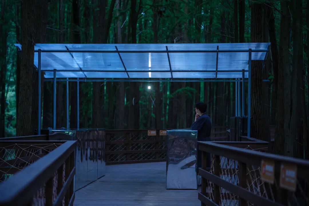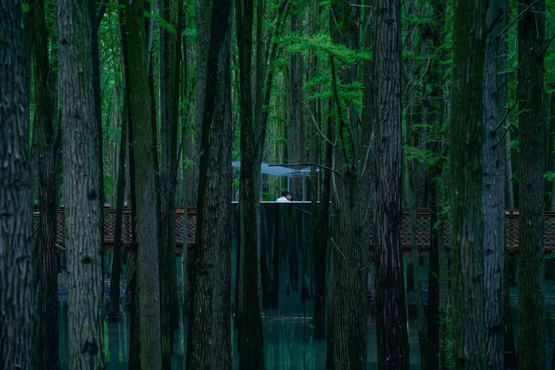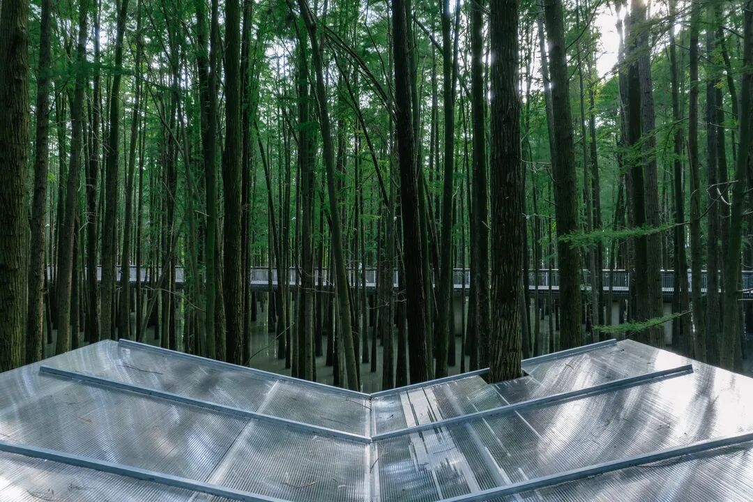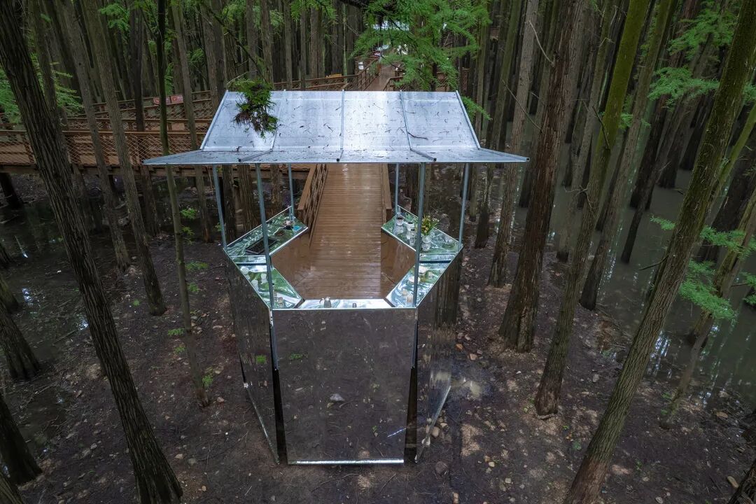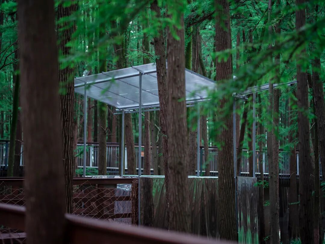此项目位于临安青山湖水上森林公园内,是为2022年6月1日开幕的器物艺术展(参展艺术家有余元枫、童心笛等)而建造的临时展亭。在面积约100万平方公里的水上森林中,生长有1万余棵池杉和落羽杉,并建有木结构游步道供游人穿行。由于夏季涨水,部分树干乃至游步道都会被湖水淹没,因此,临时展亭在建成后仅保存一个多月。