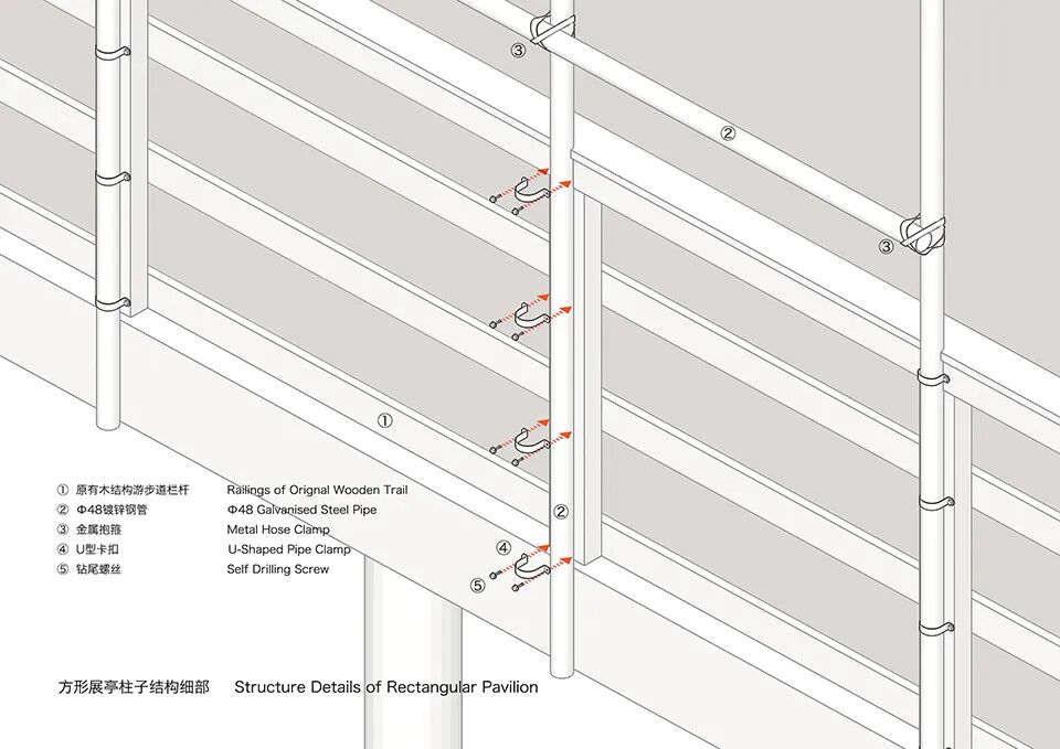 为追求轻盈的效果,我们放弃了成品脚手架十字扣连接件,创造出金属抱箍加螺栓的方式固定镀锌钢管。屋面的阳光板上加有方钢,既作为檩条,又辅助屋面排水。为使展亭隐于林中,用镜面纸作为展台的覆层,意欲把森林的色彩和质感赋予展亭的表皮之上。镜面纸沿游步道栏杆垂下,直至森林的地面,直至水中。