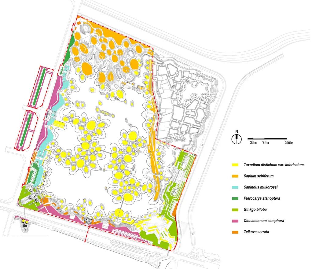 受鄱阳湖当地季风气候下形成的、洪泛适应性的湖沼湿地启发,我们选择了能够在水位涨落中生存的树种,包括落羽杉、池杉和水杉。。