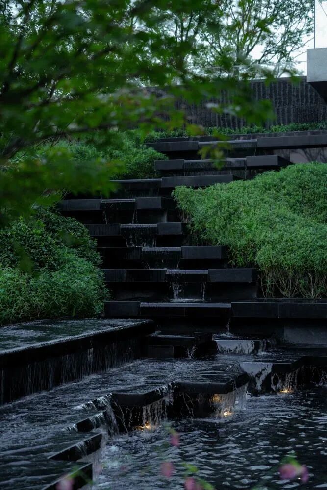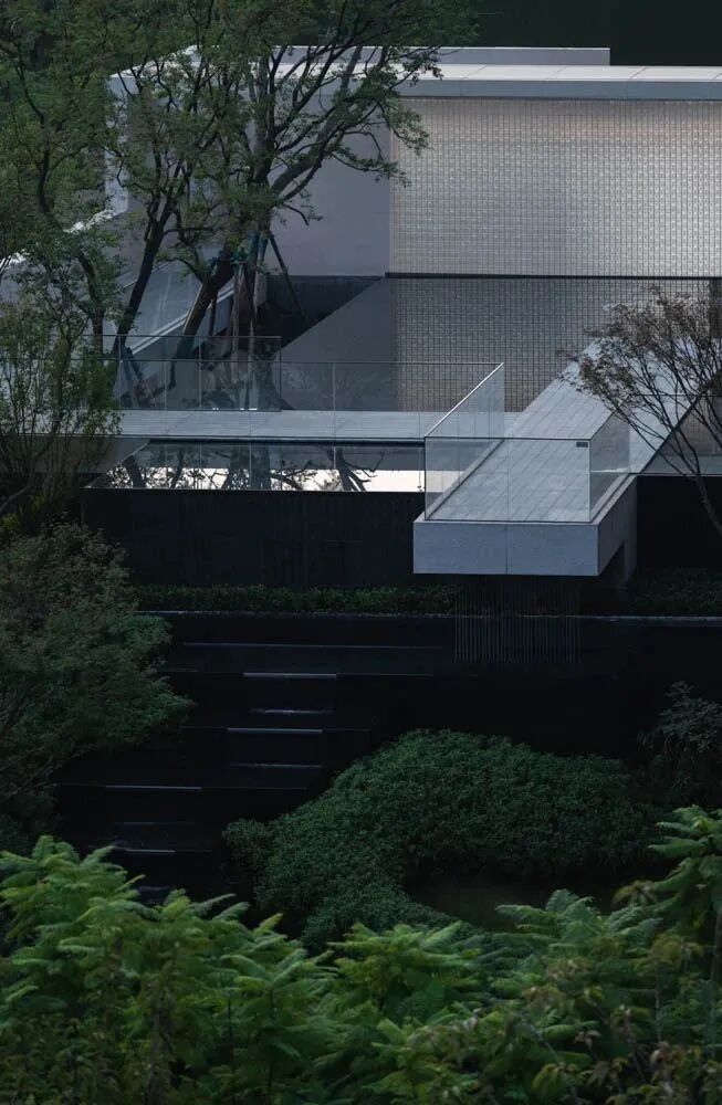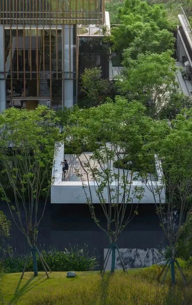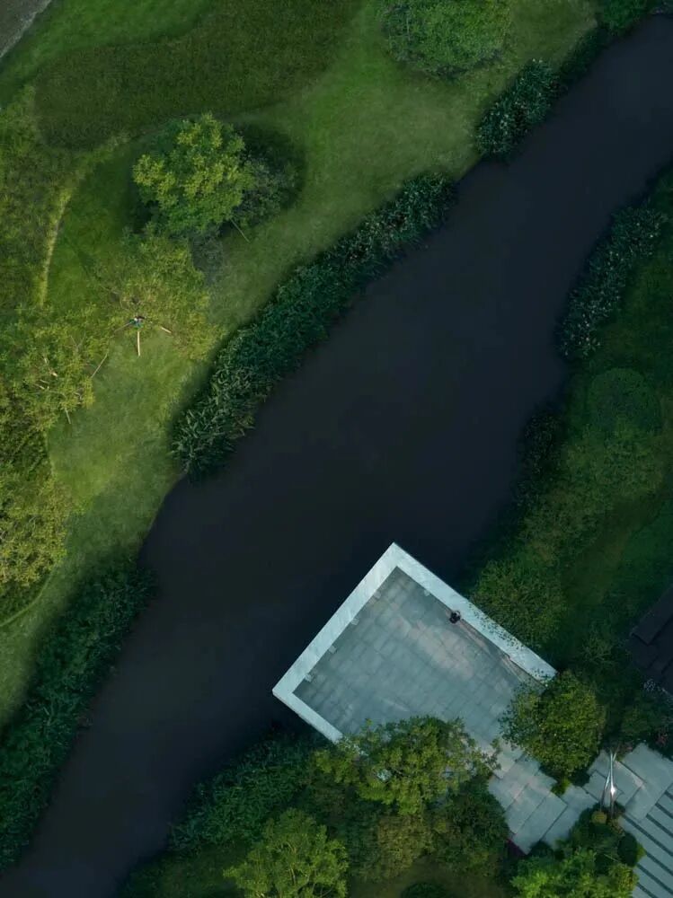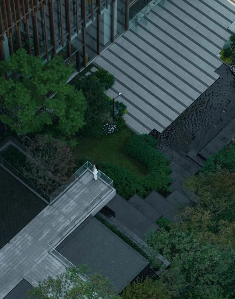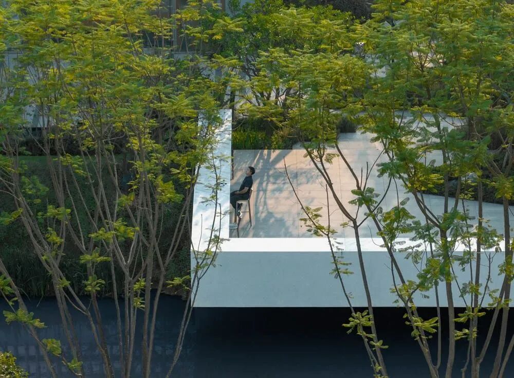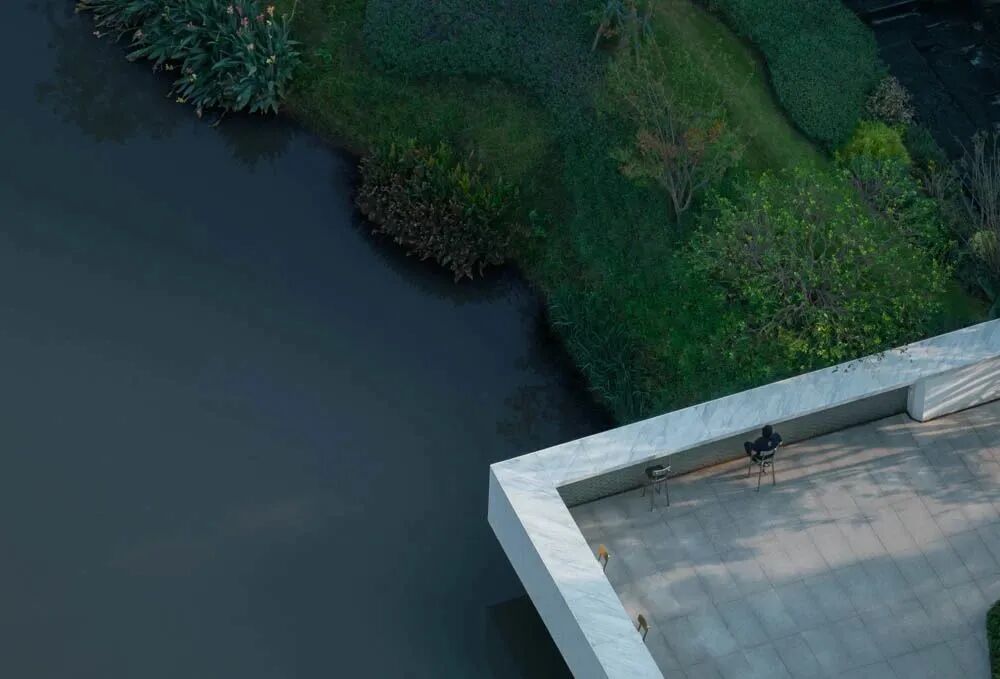 漫步于高台流水之间,不经意的走到栏杆的边缘,映入眼帘的是影影绰绰的树影和缓缓错落的层层流水,流水静谧,花木繁茂,阳光尽情挥洒,这也许就是理想生活的自然态度。