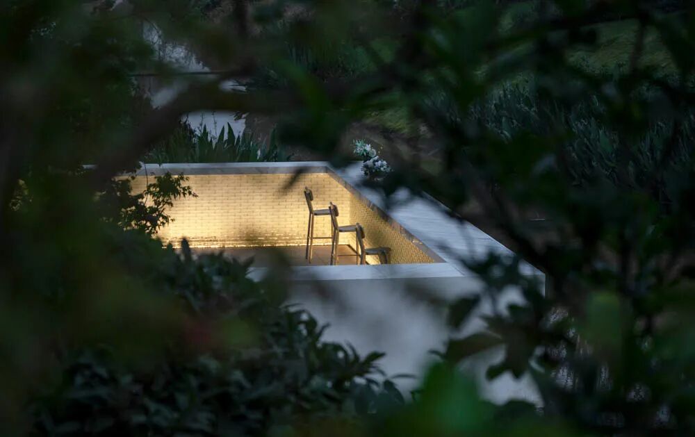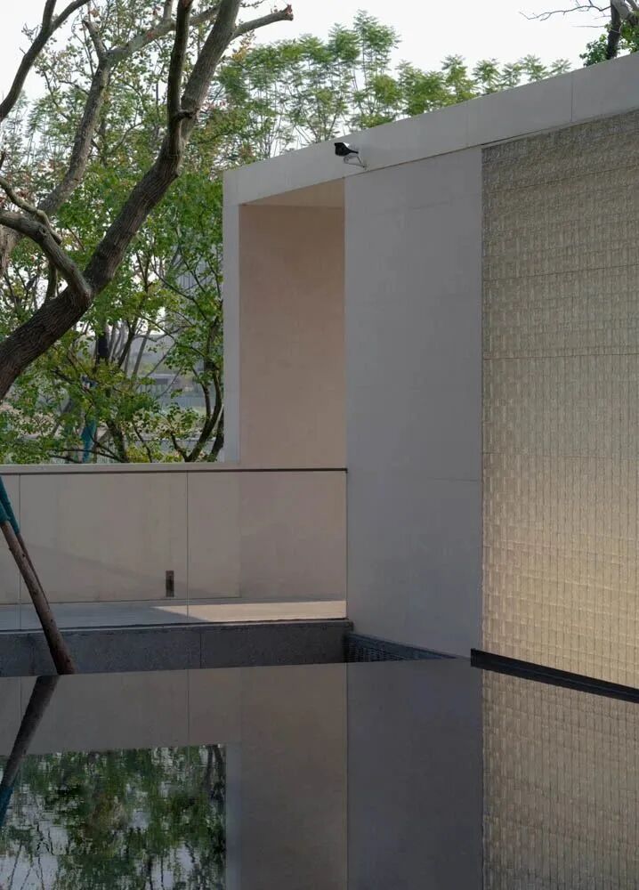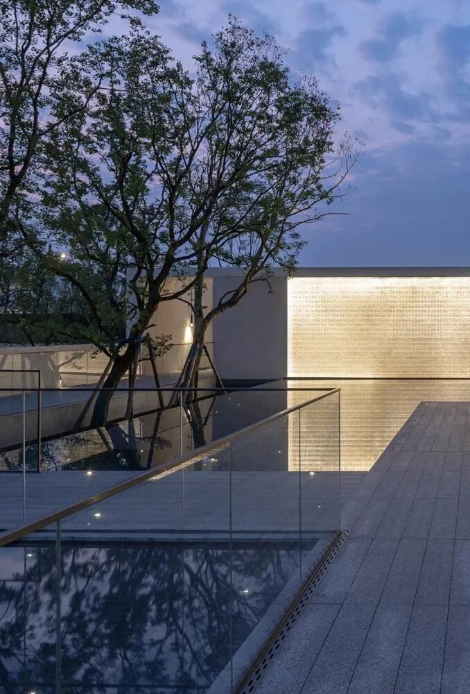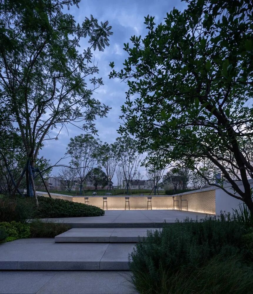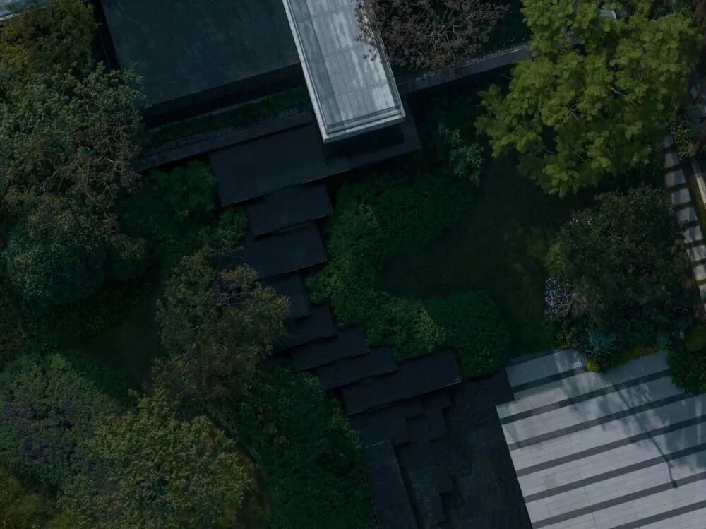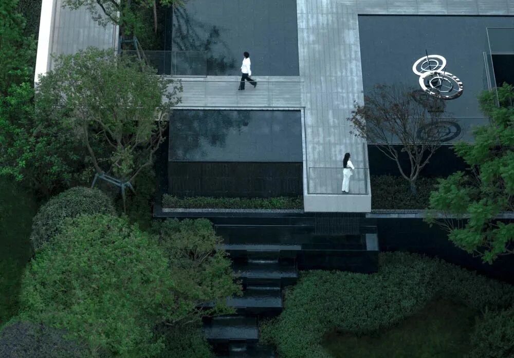 漫步于高台流水之间,不经意的走到栏杆的边缘,映入眼帘的是影影绰绰的树影和缓缓错落的层层流水,流水静谧,花木繁茂,阳光尽情挥洒,这也许就是理想生活的自然态度。