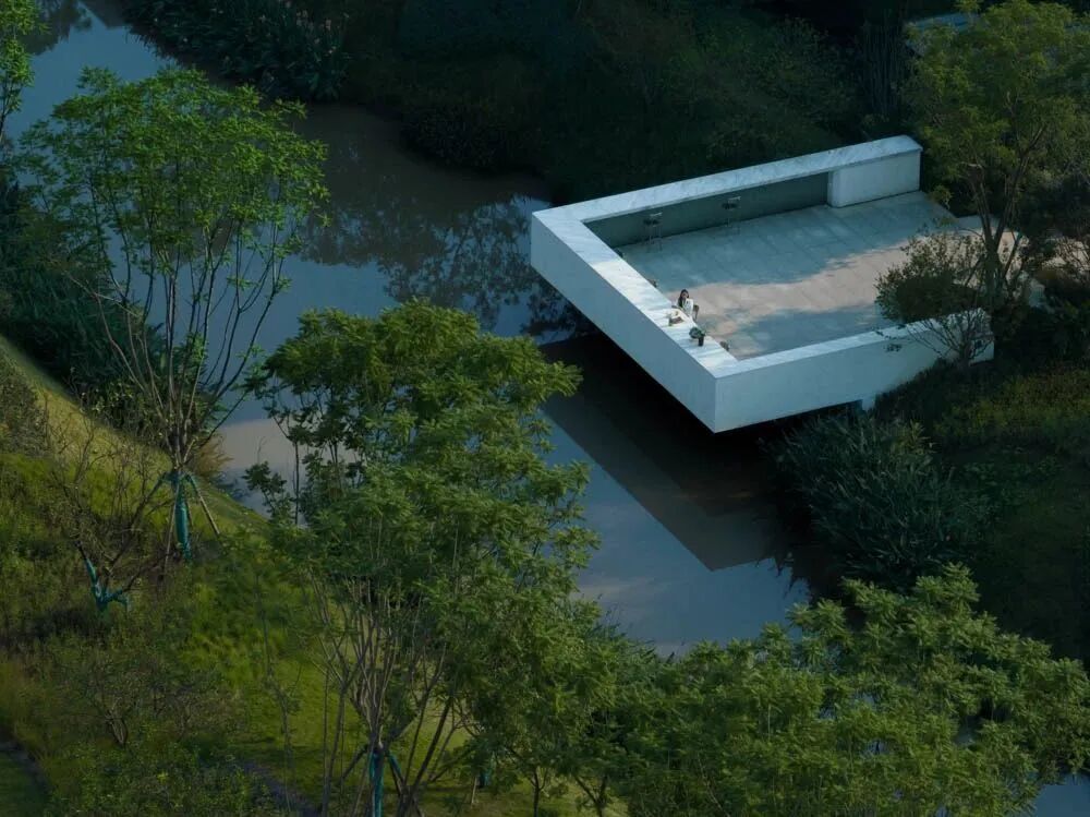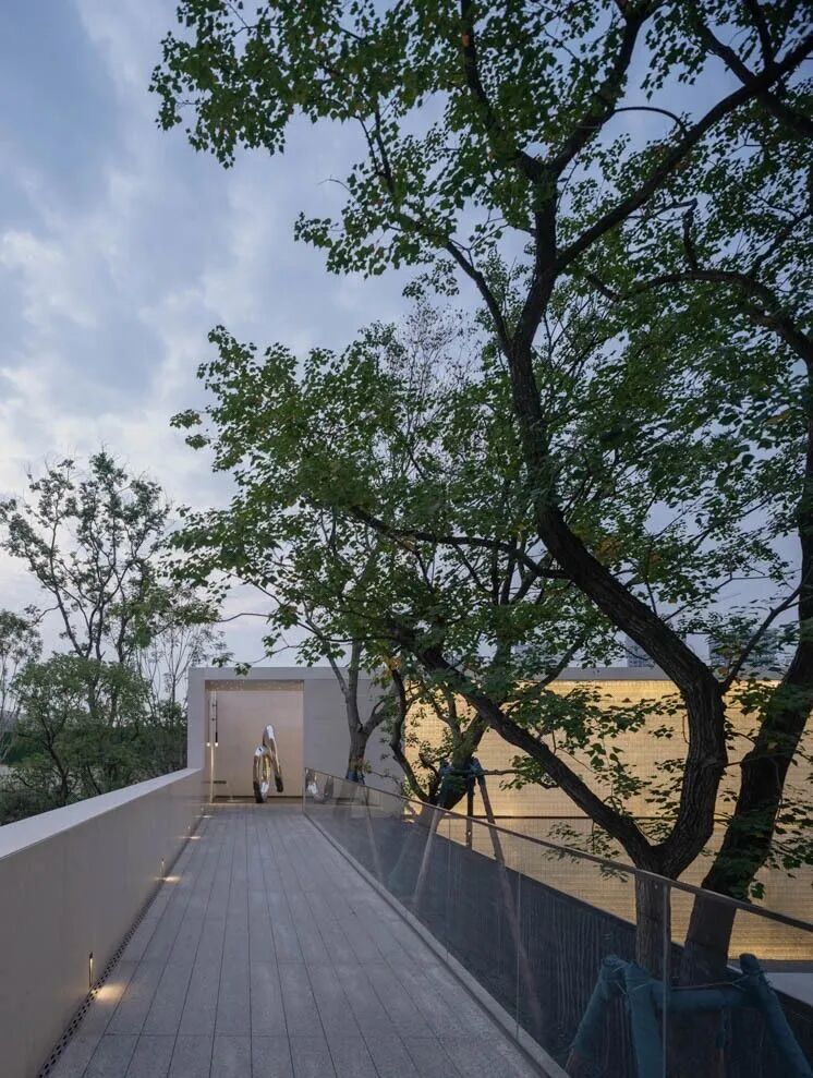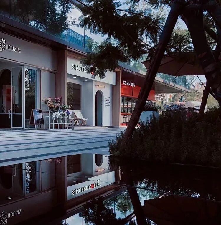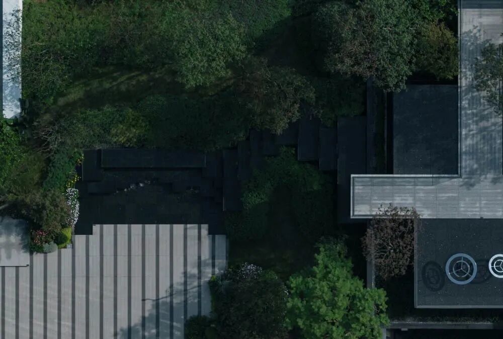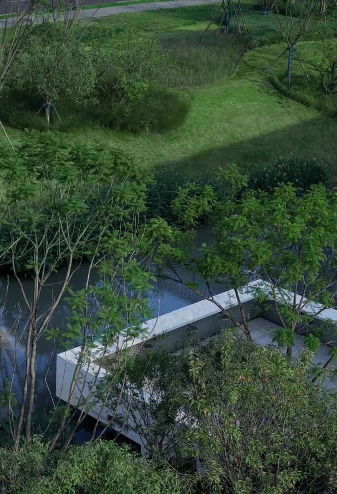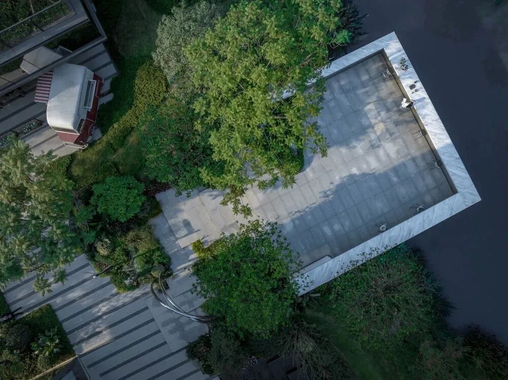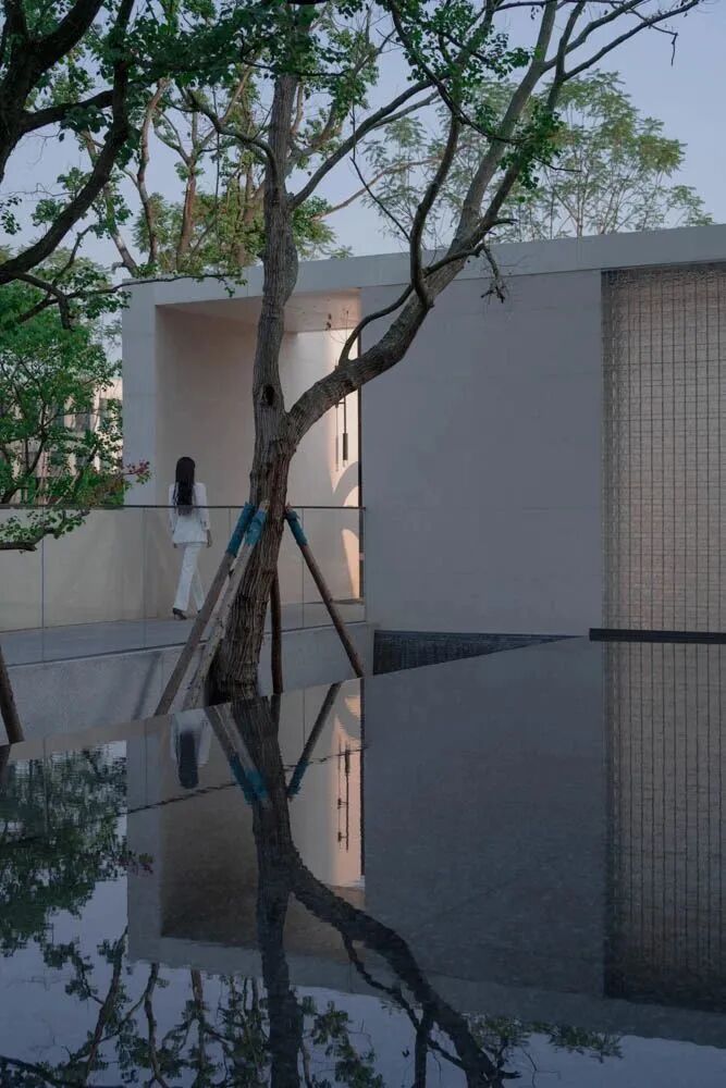 漫步于高台流水之间,不经意的走到栏杆的边缘,映入眼帘的是影影绰绰的树影和缓缓错落的层层流水,流水静谧,花木繁茂,阳光尽情挥洒,这也许就是理想生活的自然态度。