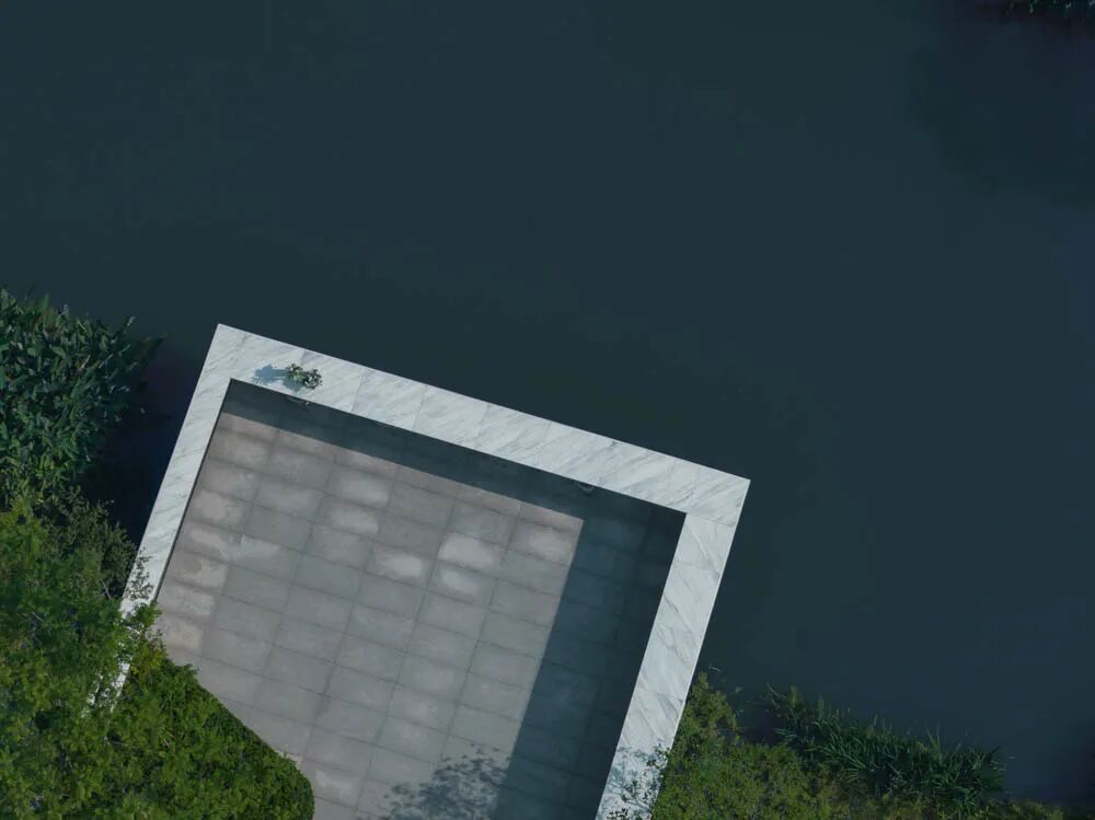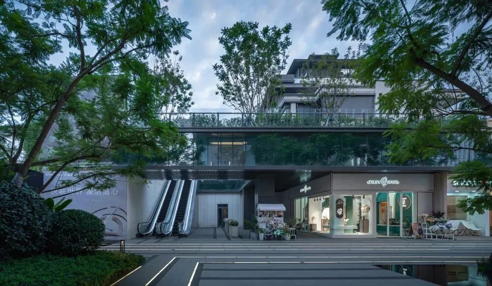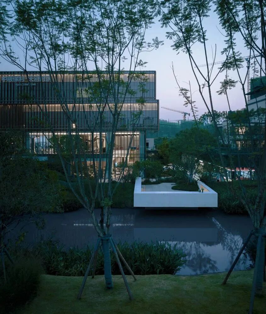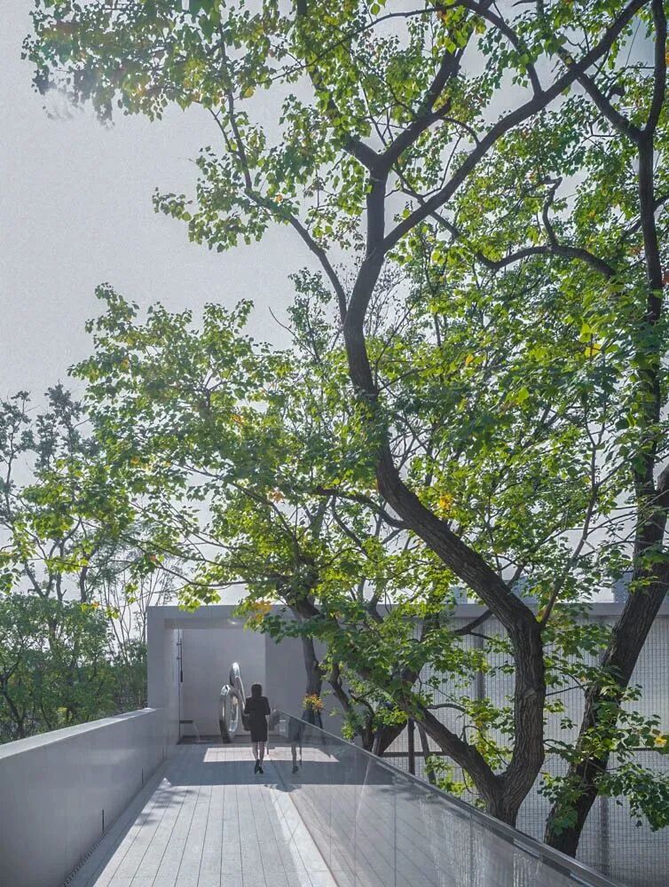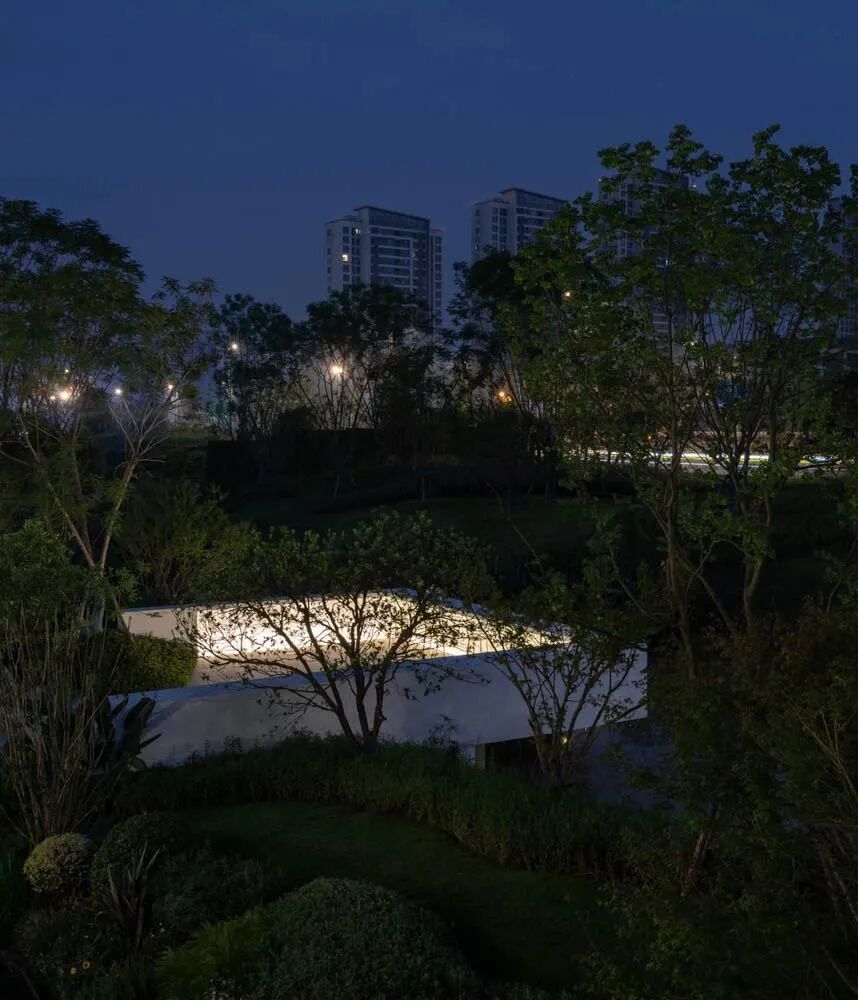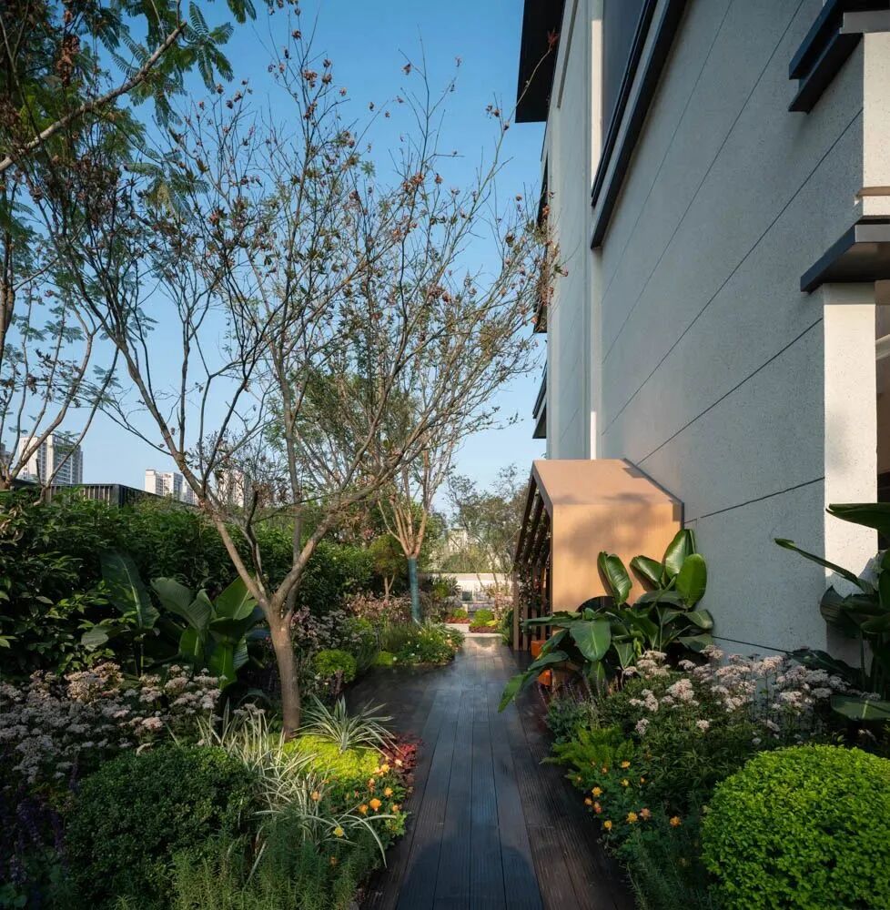 漫步于高台流水之间,不经意的走到栏杆的边缘,映入眼帘的是影影绰绰的树影和缓缓错落的层层流水,流水静谧,花木繁茂,阳光尽情挥洒,这也许就是理想生活的自然态度。