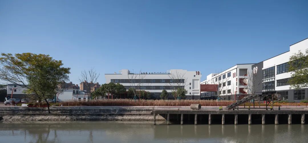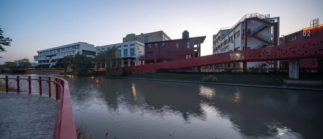 东侧横泾港两岸景观提供了良好的空间基础,三座人行桥可以联系两岸,将园区与零号湾、交大科技园联通。设计中充分利用沿河景观带,将水景、桥梁、景观小品、工业遗迹进行了一体化设计,实现东侧界面的城市融合。整个厂区东西向的空间缝合设计就势结合厂房建筑的横向展开肌理,把厂房之间的通道塑造为生活步行街,实现东西向的链接与织补。